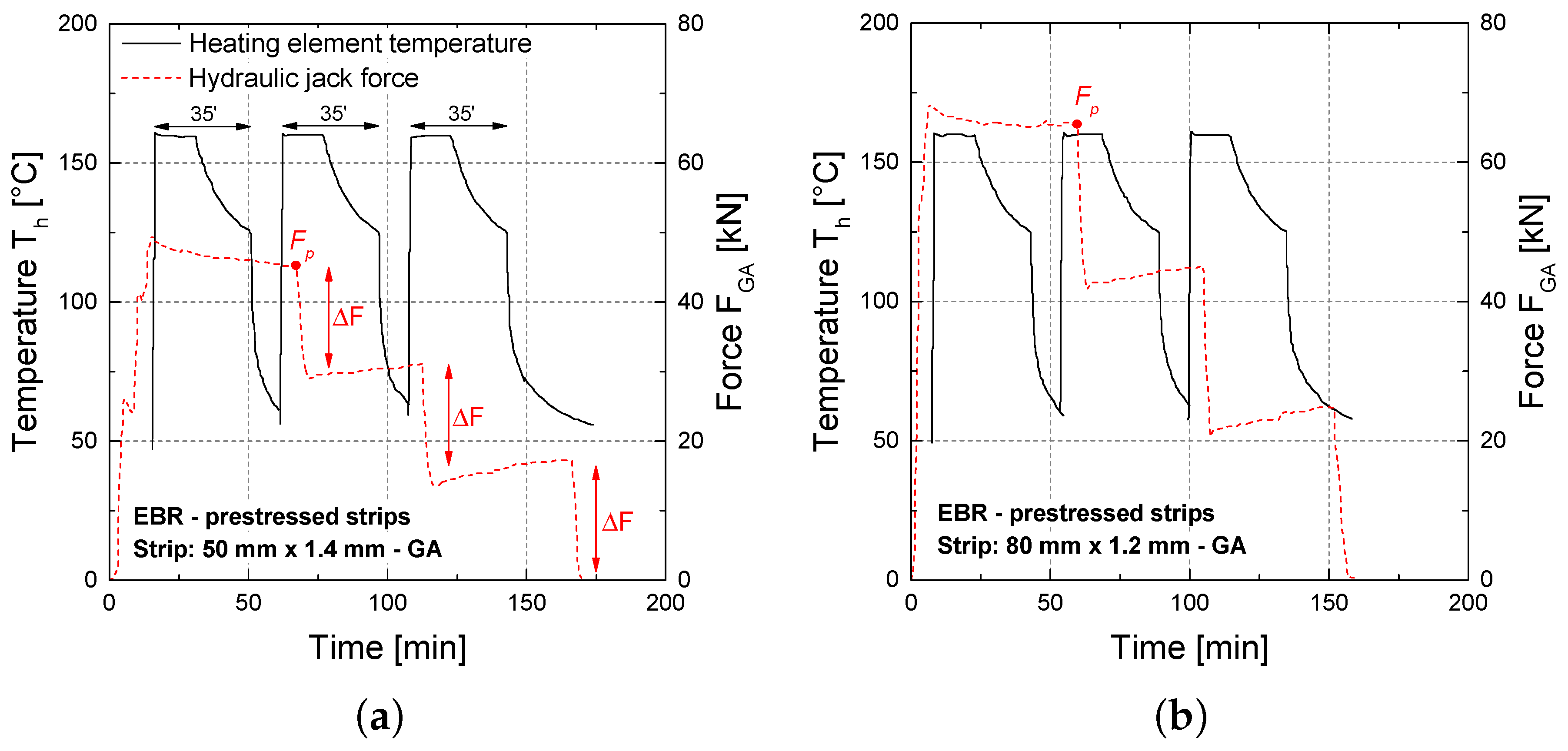 For the case of the GA system, in the ambit of the present experimental program, a 600 mm anchorage length was used, composed of three sectors (50/80 mm wide and 200 mm long each). During the application of the gradient, the specimens are always monitored in terms of applied force by the hydraulic cylinders and temperature at the distinct sectors composing the heating devices. Details about the evolution of the temperature inside the epoxy adhesive in the respective sectors during the application of the gradient can be found in Michels et al., 2013 [17]. Generally, the aimed epoxy temperature Ta is about 90 °C. The releasing force in each sector was equal to about 1/3 of the total applied force Fp. The total heating duration was 35 min with the subjected temperature profile of the heating elements Th as shown in Figure 6 for both strips 50 mm × 1.4 mm and 80 mm × 1.2 mm. Each force release ΔF was performed approximately 15 min after the initiation of the cooling phase of the corresponding sector. This waiting time was chosen in a way to ensure that the epoxy adhesive has cooled down to temperatures below 50 °C.