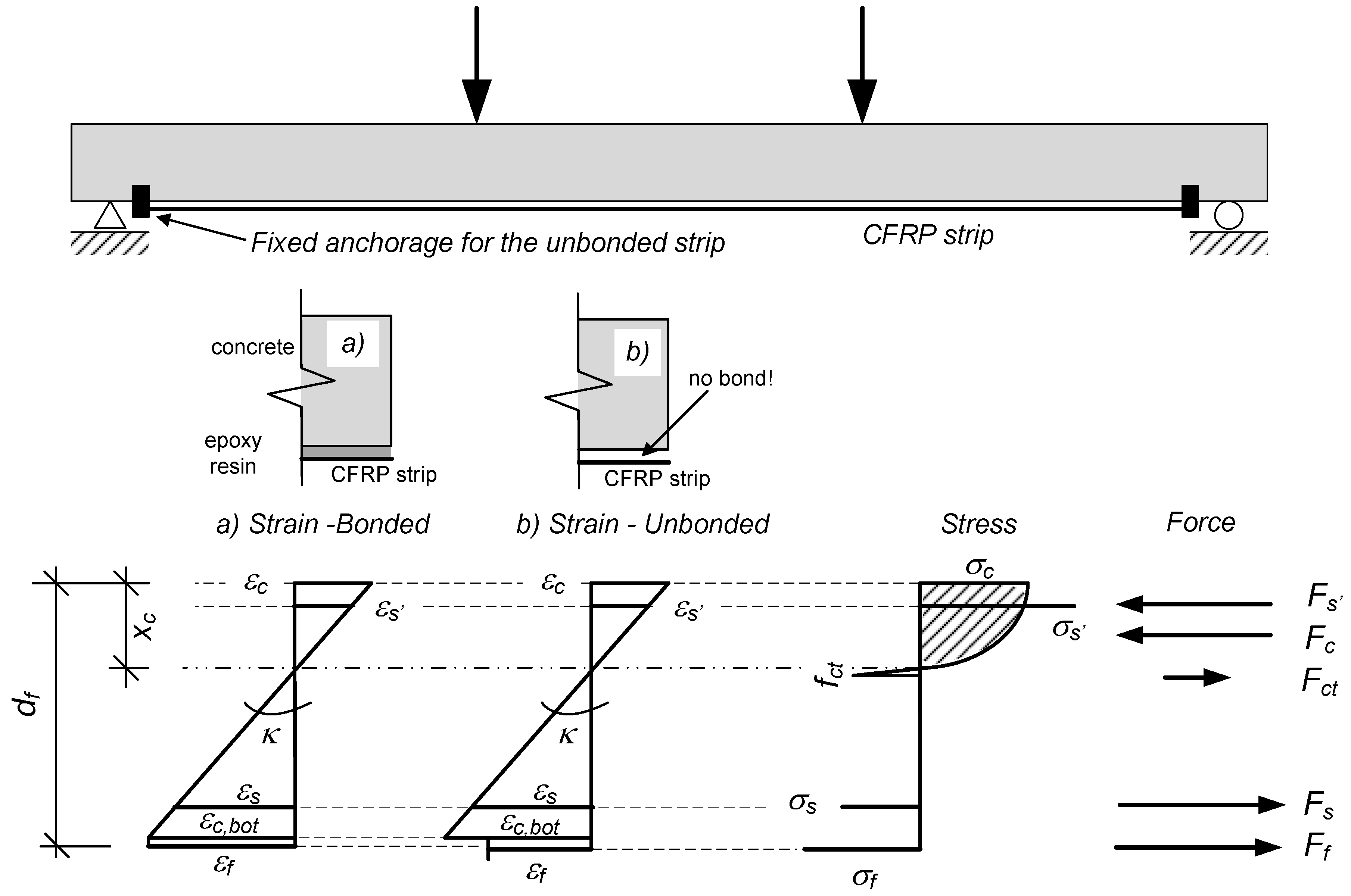 Cross-Section Analysis (CSA) was performed with a Matlab-based calculation tool. The differences in strain distribution between bonded and unbonded external reinforcements are given in Figure 7. For bonded configurations, conventional force equilibrium and strain compatibility in the cross-section can be considered. After establishing the moment-curvature (M,κ)-relation, deflection values can afterwards simply be derived by double integration of the curvature over the span length. For unbonded configurations, however, strain compatibility between the CFRP tensile strain and the bottom concrete surface is not given anymore. In this case, CFRP tensile strain εf, which is for each loading step constant over the whole strip length L, has to correspond to the average concrete tensile strain εc,bot,avg at the bottom for each loading step: