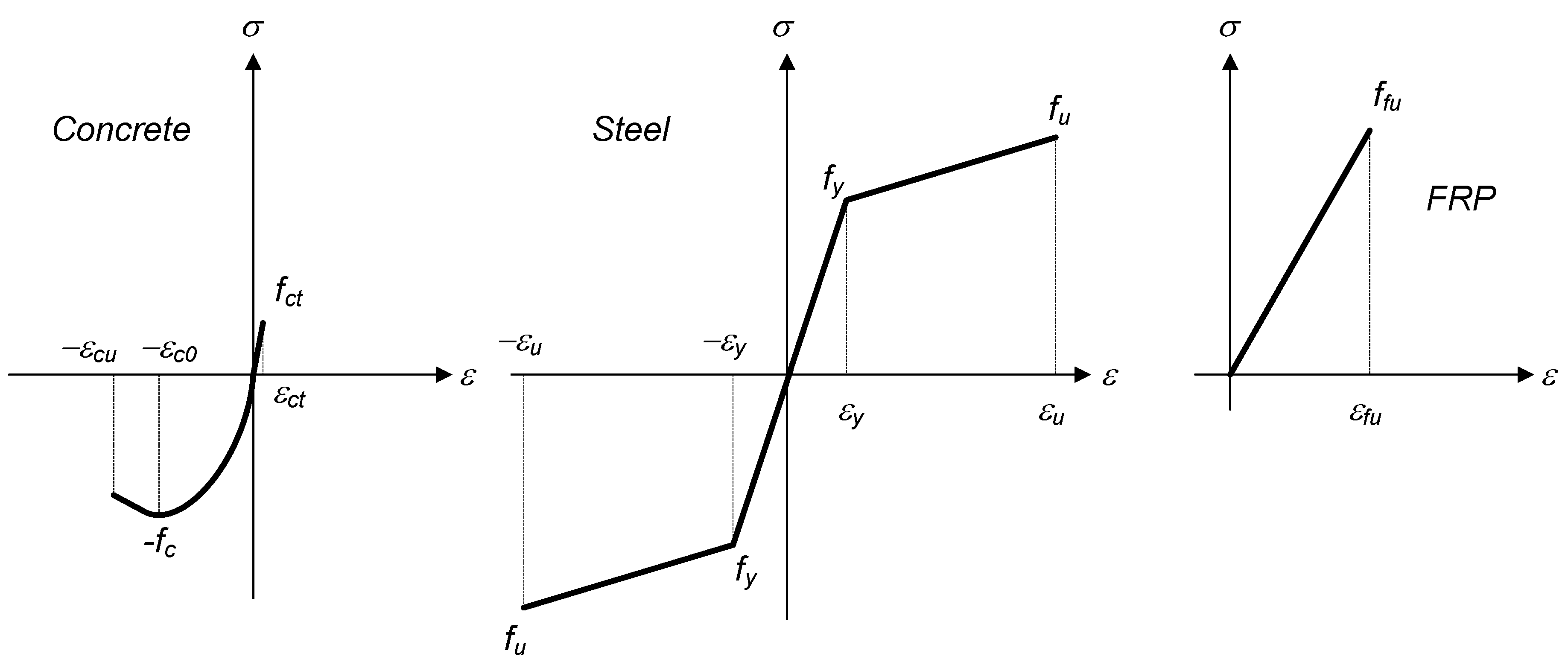 Constitutive material laws for concrete, steel, and CFRP.