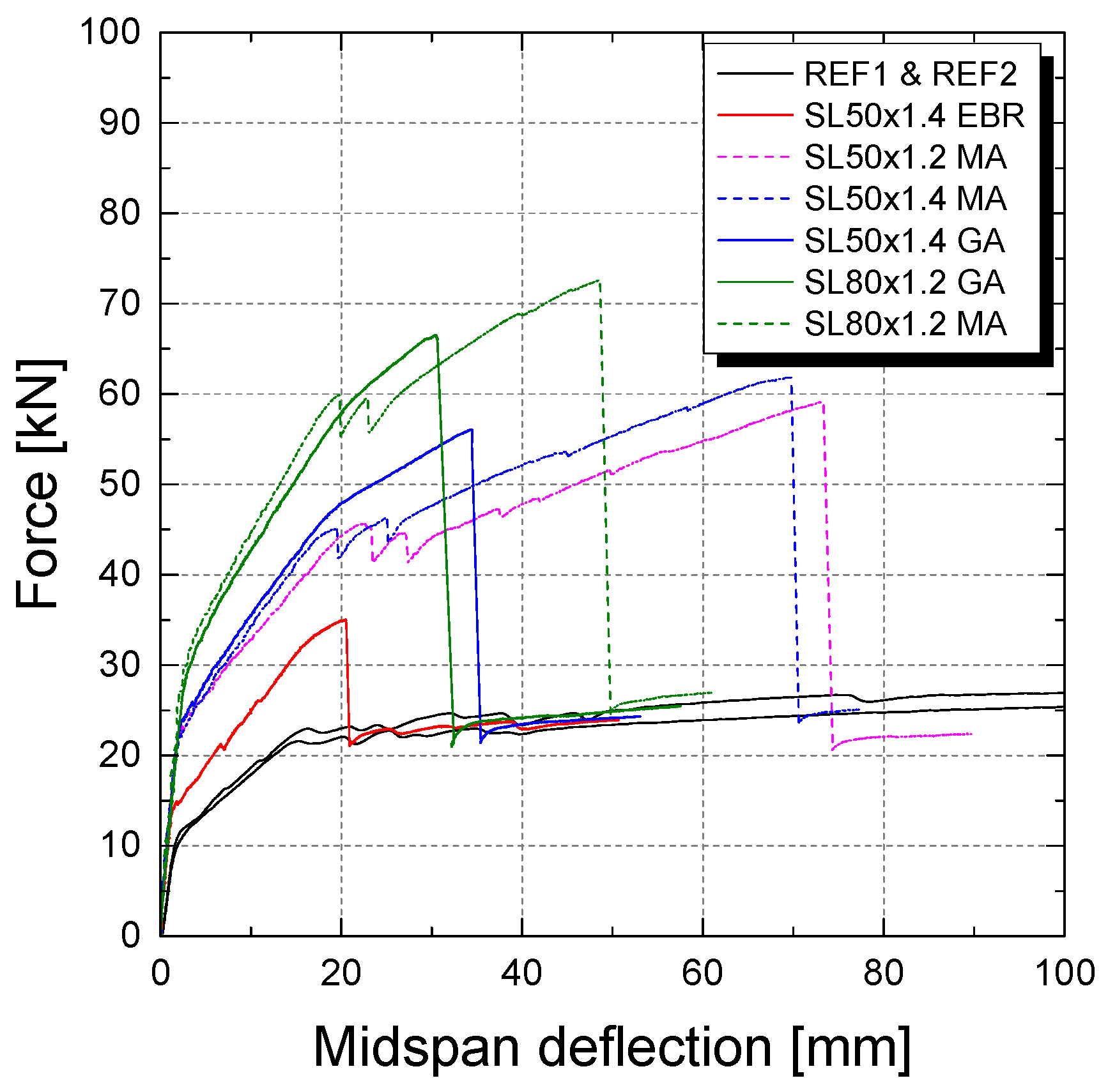 Experimental load-midspan deflection curves are presented in Figure 9, and in Figure 10 along with the numerical simulations. All characteristic results for the cracking “cr”, yielding “y”, and ultimate loading state “u” are presented in Table 4. Additionally, the structural ductility with the ductility index for deflection μδ as well as the strength factor μF as defined in Michels et al. [15] are given. As expected, the strengthened slabs (EBR, GA and MA specimens) exhibit higher cracking, yielding, and ultimate loads but lower deflections at failure compared to the reference slabs REF1 and REF2.