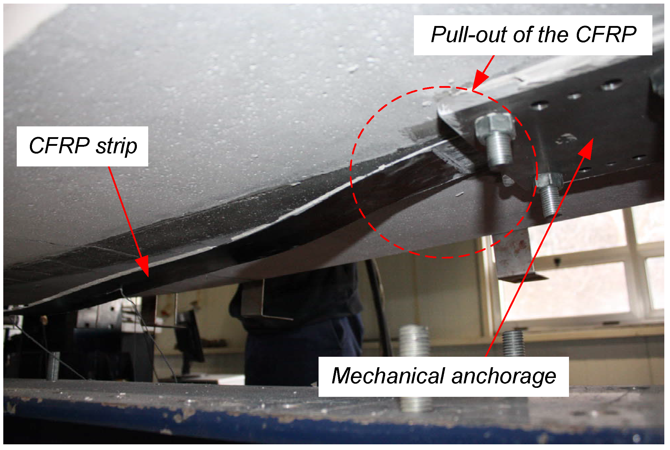 The reference slab tests were stopped at a midspan deflection of 100 mm due to the corresponding LDVT measurement range limitation. Failure mode would in this case most likely be concrete crusing on the top fiber. The strengthened slabs all exhibited CFRP strip debonding, which occured partially in the concrete substrate or in the CFRP/epoxy or epoxy/concrete interface. Debonding mostly initiated at one slab extremity and then propagated towards the other support. For the slabs with a mechanical end-anchorage, strip debonding did not implicate the immediate reaching of the ultimate load carrying capacity, since the strip was still held at its both ends. Further load increase was still possible. Eventually, the strip was pulled out of the mechanical anchorage as shown in Figure 11. Details regarding the structural behavior will be discussed in the next sections. The slabs with gradient anchorage exhibited a more sudden strip debonding, as in this case no mechanical end-fixing could provide additional anchorage resistance.