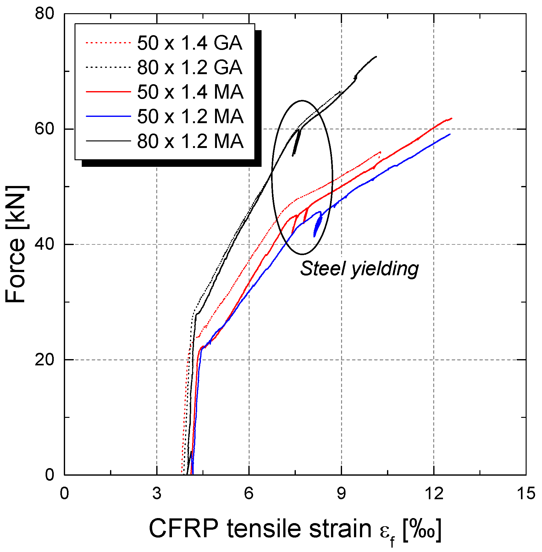 Up to yielding initiation, GA and MA systems exhibited similar behavior (Figure 10d,e). From this point on, additional contribution provided by the steel reinforcement is limited, the CFRP strip being now responsible to carry additional load. This is the reason why the force increment carried by CFRP material drastically increases at the onset of yielding initiation (Figure 12). For all MA slabs, two drop points can be observed just after yielding initiation. These two drops are related to a strip debonding initiation at the both extremities (in between the metallic plate anchors). After this point the slab still continues to carry load due to the existence of the metallic anchors that avoided the premature debonding of the CFRP laminate strip. For this reason, the slabs of MA series present a better performance in terms of ultimate load when compared with the GA series, for which the initial debonding process is rapidly transformed into the complete strip detachment. In Table 4, it can be seen that the ultimate loads reached with a mechanical anchorage are about 10% higher than for a gradient anchorage. Deflection at failure, is around 103% (50 mm × 1.4 mm) and 59% (80 mm × 1.2 mm) higher for a mechanical anchorage compared to a purely bond-based gradient anchorage. In terms of structural ductility, both times the MA exhibit a more favorable behavior with ductility indexes of 3.92 and 2.64 for the strip section 50 mm × 1.4 mm and 80 mm × 1.2 mm, respectively. The same is valid for the additional force increase after yielding initiation.