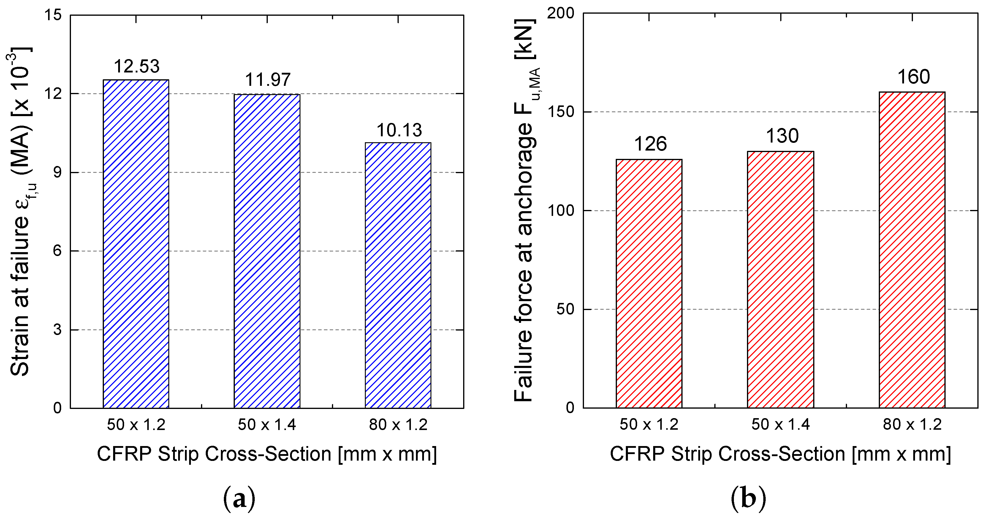 When switching to the clearly higher CFRP cross-section 80 mm × 1.2 mm, due to the higher prestress force, the overall behavior under loading is obviously stiffer compared to the more narrow strip with bf of 50 mm. When slabs SL50x1.2_MA and SL80x1.2_MA are compared (Figure 10c,e,) in terms of pull-out load at the end-anchorage, a higher force for the laminate with a higher cross-section can be deducted (see Figure 13). A strip width bf of 80 mm results in an anchorage resistance of about 160 kN, whereas a more narrow laminate with bf = 50 mm implicates a pull-out force of 126 kN. When comparing an average shear stress over the anchorage length of 270 mm the narrow strip delivers a higher strength than the larger one (9.16 MPa against 7.40 MPa). However, the CFRP strip with a higher axial stiffness might also implicate higher peak shear stresses at the anchorage tip (location where the laminate exits the anchorage zone towards midspan), being again responsible for an earlier strip pull-out. All in all, structural ductility is reduced when a higher CFRP cross-section is prestrained to the same level. Whereas relative force increases after yielding are rather similar for both cross-sections (SL50x1.2_MA and SL80x1.2_MA), clearly higher ductility indexes can be notived for the more slender strip. This behavior is analogue to classic prestressed concrete, for which a higher prestress level results in an enhanced cracking and yielding load, which eventually goes together with a reduced structural deformation capacity.
