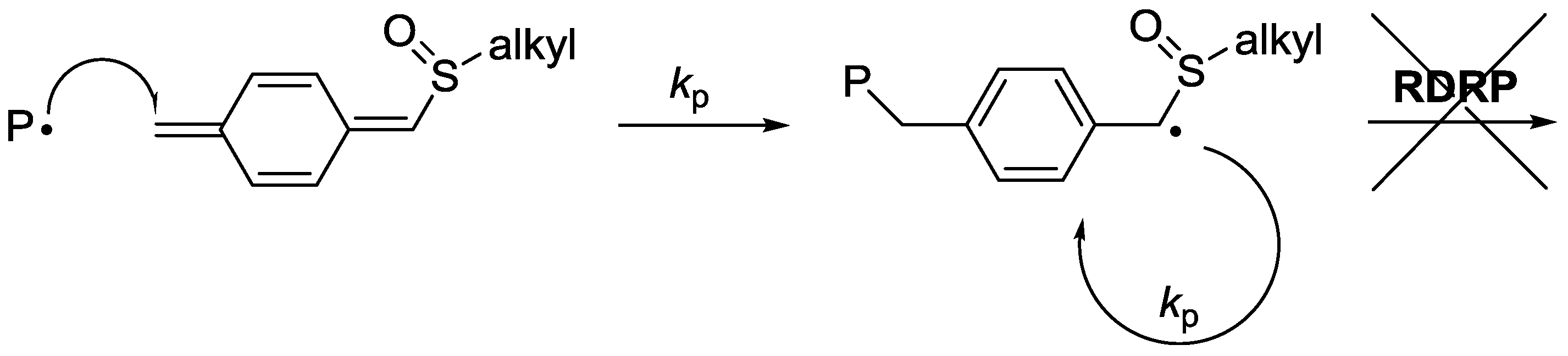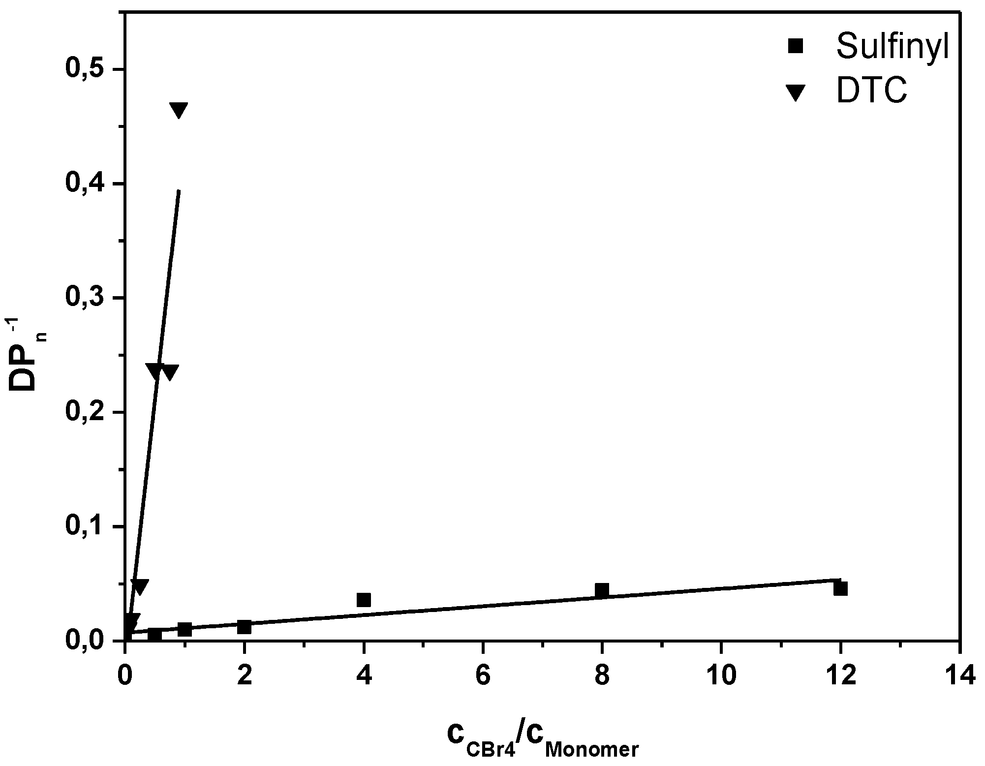 In further investigations, a deeper look into the chain transfer kinetics of the sulfinyl route was taken. Despite the better performance of the DTC route, similarly good materials can be accessed at higher equiv. of CBr4 in the sulfinyl route. Moreover, even though general uncertainties exist for precursor polymerizations with respect to mechanism and individual rate coefficients, the sulfinyl route is amongst the best studied precursor routes [16,17,18,19,20]. Further systematic kinetic investigation of this reaction type is thus highly useful and thus the reason why—in spite of the better results for the DTC route—further investigation still focuses on the sulfinyl route. To date, no reliable initiation, propagation or termination coefficients are available for any precursor polymerizations, but efforts to fill this gap have been so far mostly focused on the sulfinyl route.