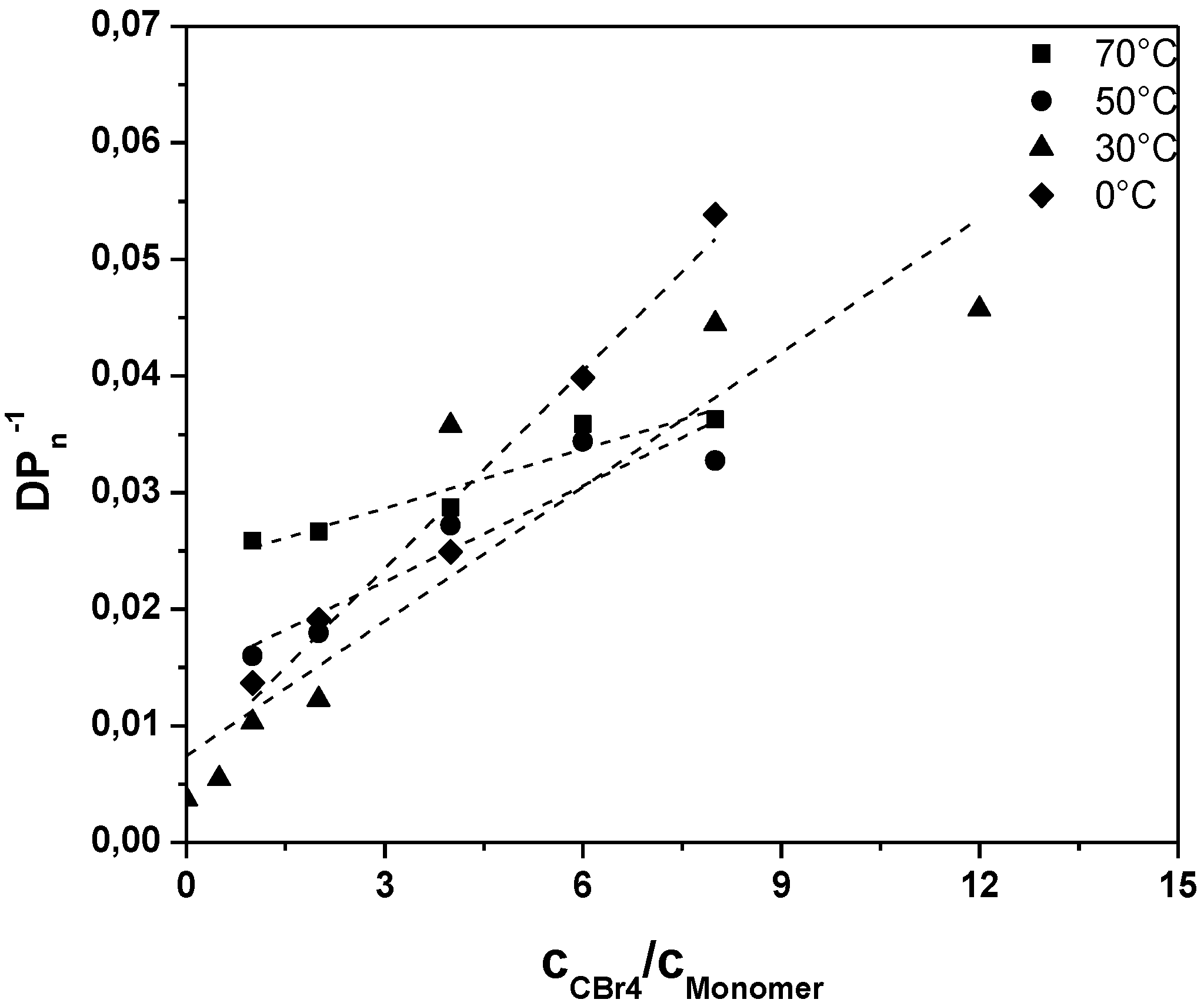 A closer look towards the activation energy of chain transfer can help in understanding the otherwise rapid sulfinyl route polymerization. Polymerizations under variation of the CTA concentration were thus conducted at different temperatures and analyzed towards the conjugated MDMO-PPV polymer (see Figure 2, Table 3 and Appendix Table A1).