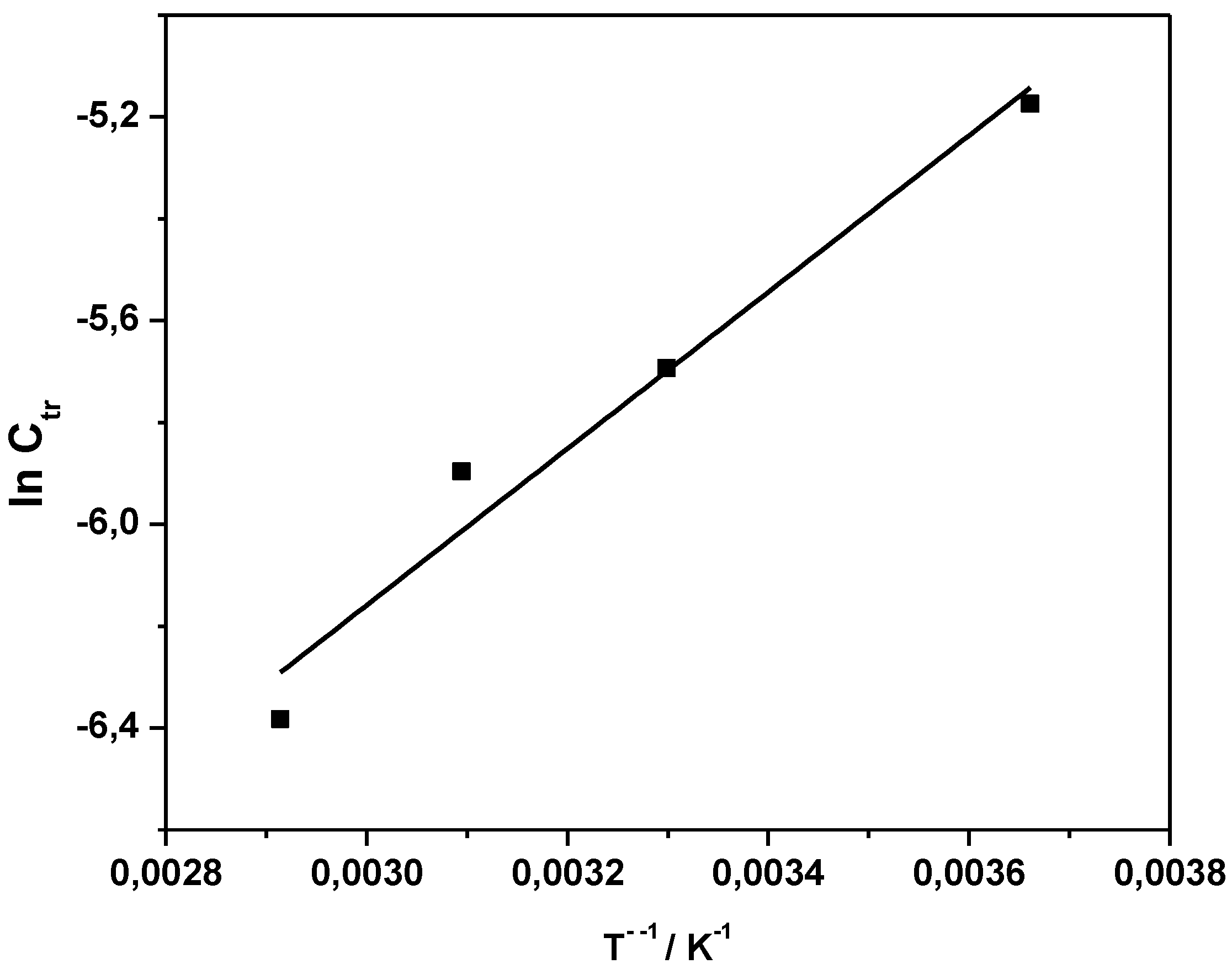 Results clearly demonstrate that upon increase in reaction temperature, a decrease in the transfer constant is followed. At the same time, lower DPno is reached with increasing temperature, indicating that also the ratio of termination, propagation and initiation changes strongly with temperature. The decreasing Ctr indicates that either propagation increases stronger with temperature than radical transfer, or that transfer becomes overall less effective at higher temperatures. Analysis of the Arrhenius relation for Ctr yields an apparent activation energy EA(Ctr) of the coupled parameter of −12.8 kJ·mol−1 (see Figure 3). The negative value is explained by the relation EA(Ctr) = EA(ktr) − EA(kp). The negative value thus indicates that the activation energy of propagation is larger than that of transfer. Under assumption that radical transfer is usually associated with activation energies in the range of 20 kJ·mol−1, the conclusion can be drawn that the activation energy of propagation is in the range of 30 kJ·mol−1 or higher, a value that is common for radical propagation reactions.