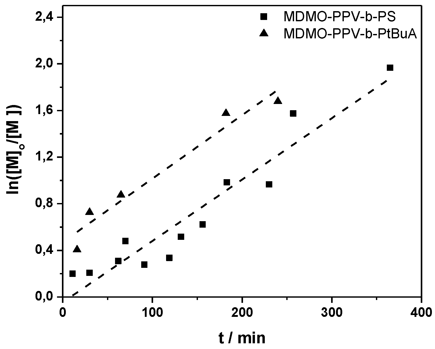 In here, we thus focus in-depth on two different aspects of the polymerization method described above. First, we discuss in detail the kinetics of the process on the basis of a broad dataset generated for CBr4-controlled precursor polymerization. Subsequently, we explore the synthetic potential of the technique compared to our previous study. For the kinetic study, we focus on the controlled synthesis of MDMO-PPV and 6-(2-chloromethyl-4-methoxy-5-[(octylsulfinyl)methyl]-phenoxy) hexanioc-acid methyl ester (CPM-PPV) using CBr4 as CTA. Also, differences between the sulfinyl and the dithiocarbamate (DTC) precursor route are elucidated. The range of polymer chain lengths that is accessible is thoroughly determined and activation energies for the transfer constant are derived shining light on the not yet fully resolved precursor polymerization mechanism. Secondly, the scope of the ATRP chain extension of sulfinyl precursor MDMO-PPV is extended by synthesizing a variety of block copolymers with styrene or t-butyl acrylate to obtain well-defined PPV-b-PS and PPV-b-PtBuA with varying block lengths and compositions. Finally, end group modification and subsequent conjugation of the PPV-b-PtBuA block copolymers using copper catalyzed azide-alkyne cycloaddition (CuAAC) click-chemistry results in an (comparatively) easy to purify PPV-b-PtBuA-b-PEG triblock copolymer—the first of their kind to the best of our knowledge. By combining the excellent optoelectronic properties of PPVs with the advantages of CRP routes, a new generation of highly specific precision block copolymer materials with advanced architecture and sophisticated physical properties becomes available, opening new avenues for conjugated materials outside the field of organic electronics [42,43].
