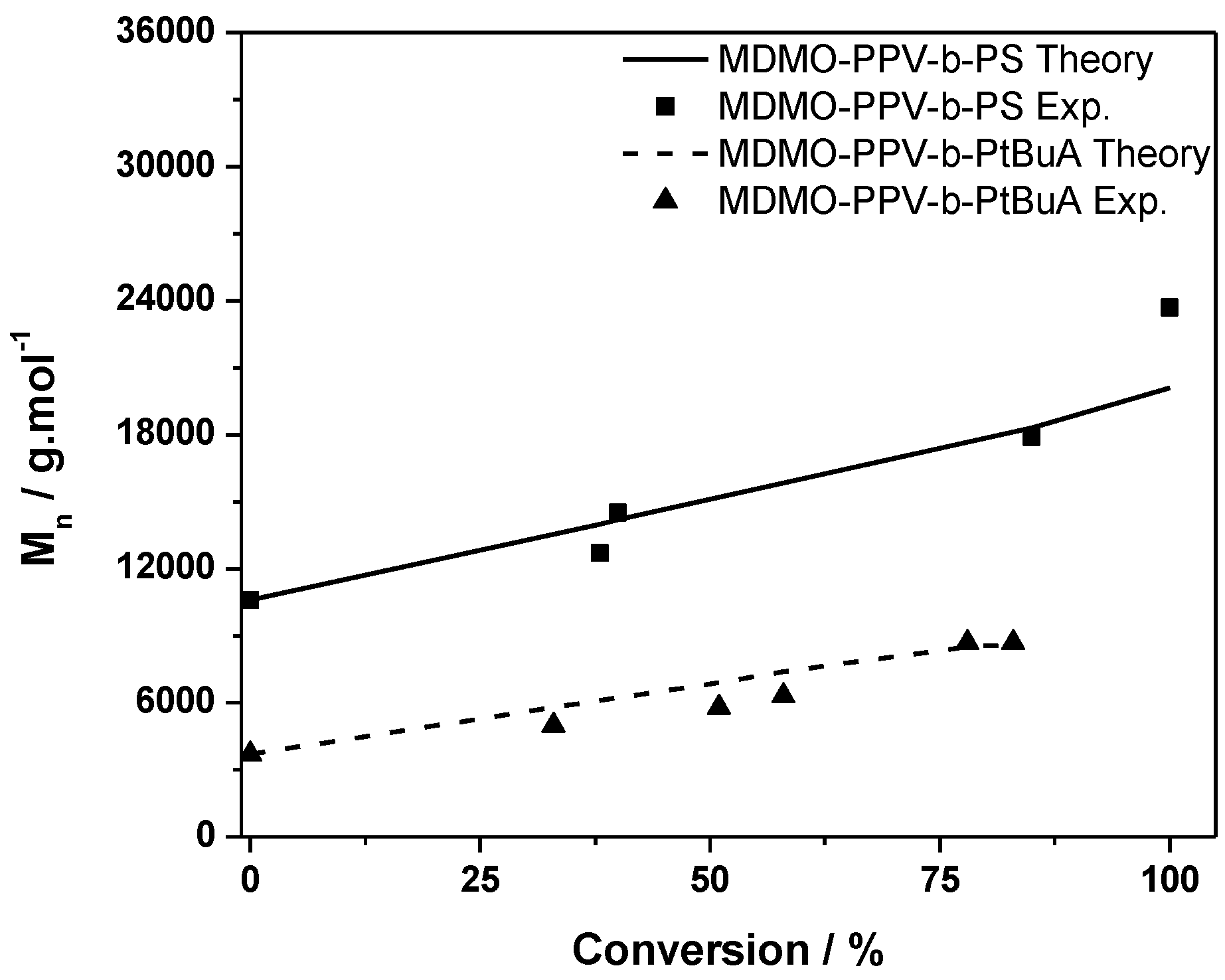 Synthesis of MDMO-PPV-b-PtBuA and MDMO-PPV-b-PS block copolymers using ATRP chain extensions.