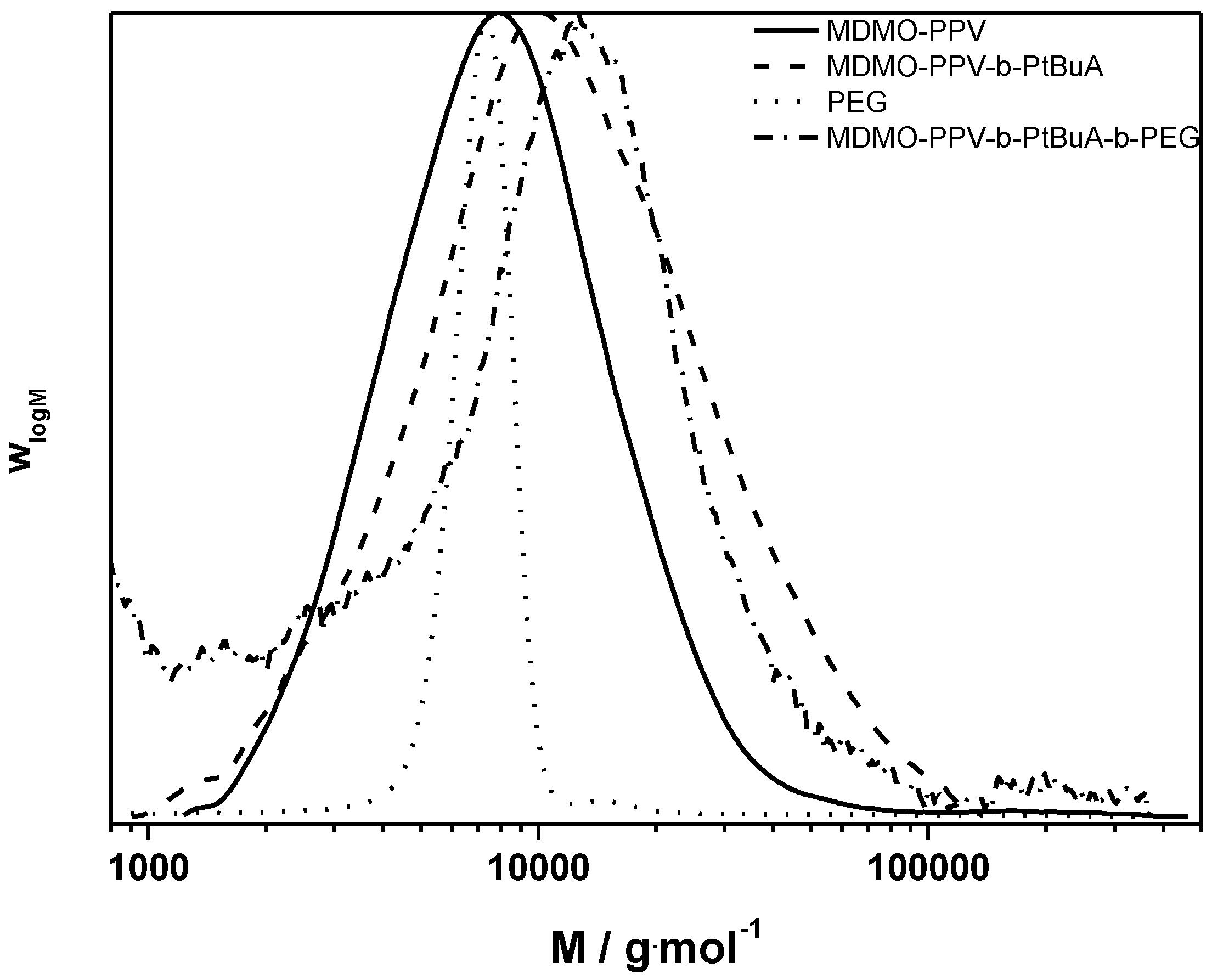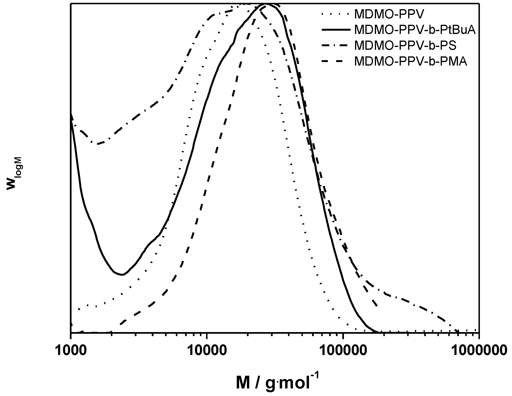 GPC profile of bromine functionalized MDMO-PPV and MDMO-PPV-b-PtBuA, MDMO-PPV-b-PS, MDMO-PPV-b-PMA block copolymers using SET-LRP reaction conditions.
