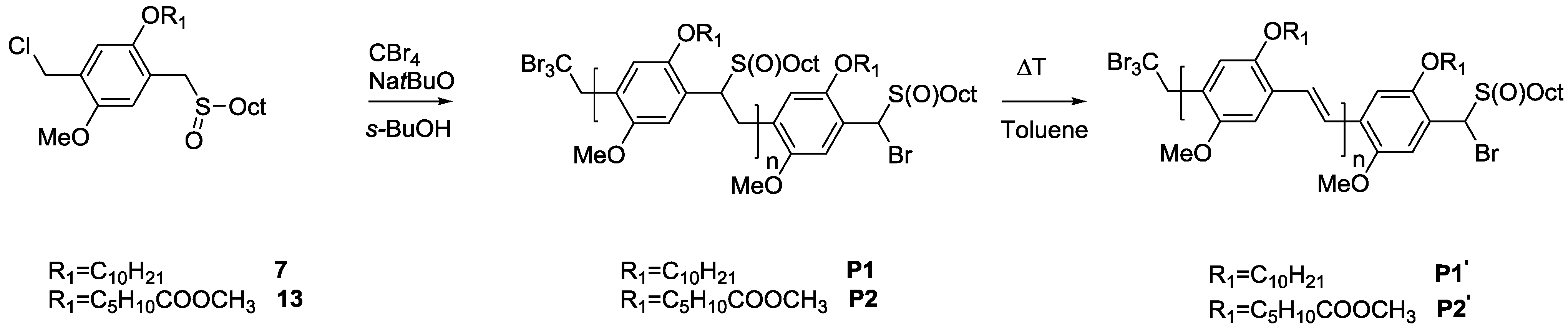 2.5.1. General Method for the Polymerization of Bromine-Functionalized MDMO (P1) or CPM (P2) Sulfinyl Precursor PPV