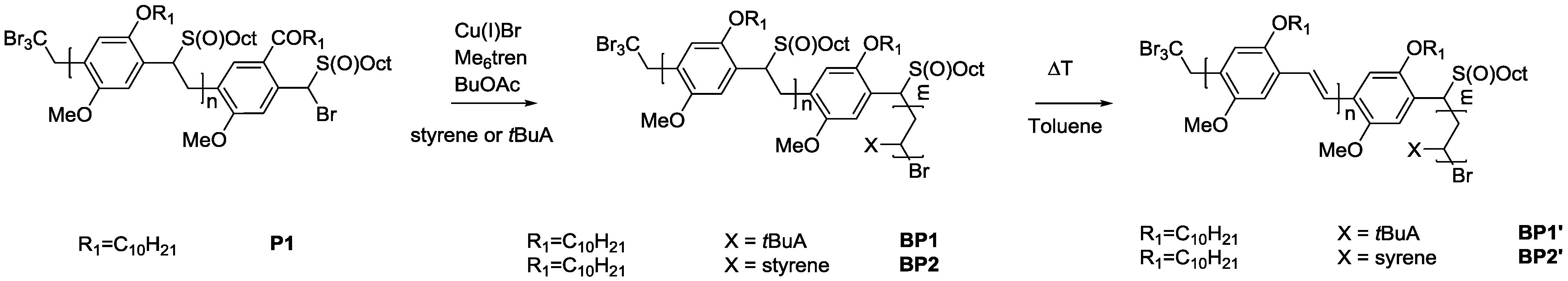2.6.2. Thermal Elimination of the Precursor MDMO-PPV-b-PtBuA BP1 and MDMO-PPV-b-PS BP2 Block Copolymers