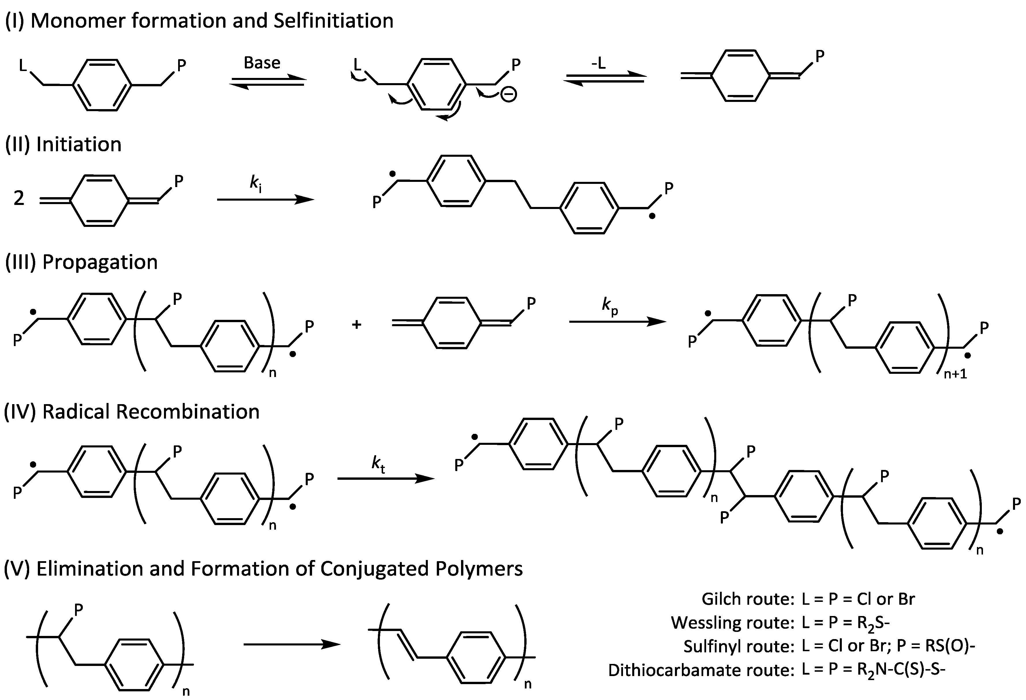 Reaction mechanism of precursor polymerizations and subsequent conversion of precursor polymers to conjugated PPV.