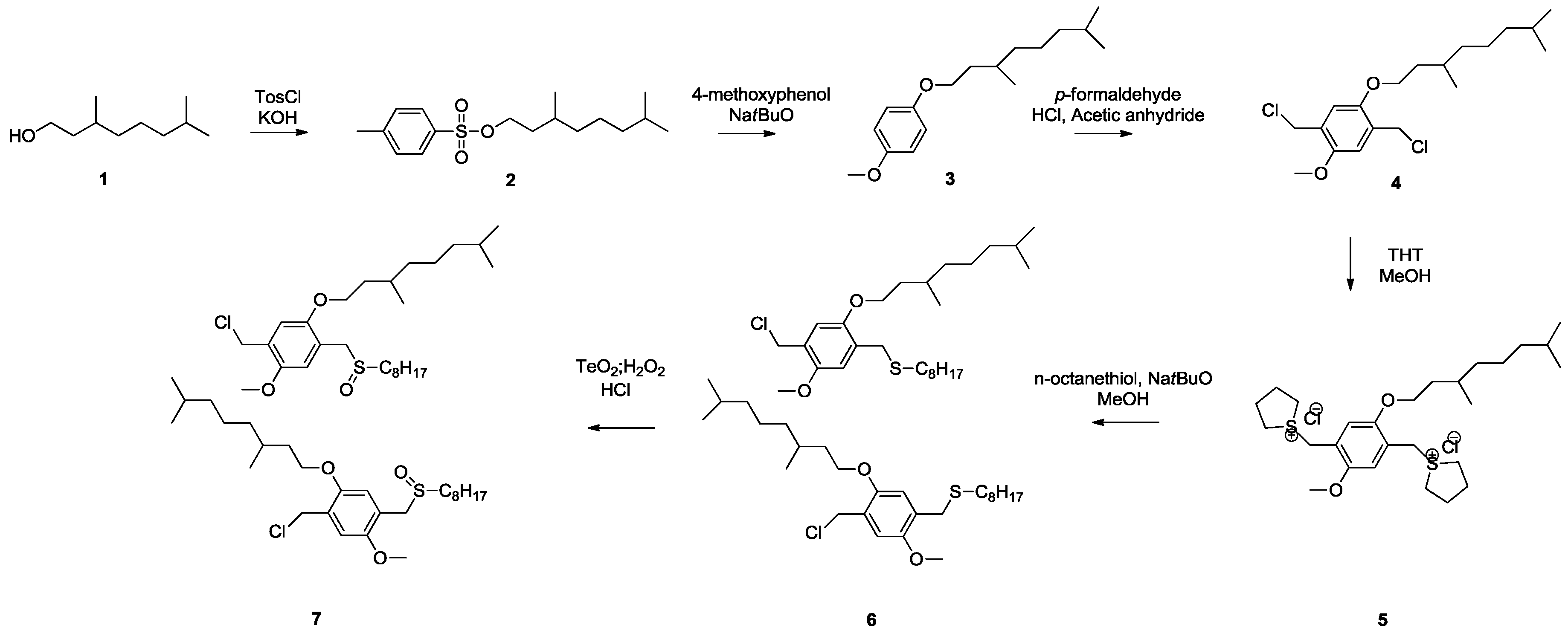 - Lutsen, L.; Van Breemen, A.; Kreuder, W.; Vanderzande, D.; Gelan, J. Highly selective route to unsymmetrically substituted 1-{2-[(butylsulfanyl)methyl]-5-(chloromethyl)-4-methoxyphenoxy}-3,7-dimethyloctane and isomers toward synthesis of conjugated polymer oc1c10 used in LEDs: Synthesis and optimization. Helv. Chem. Acta 2000, 83, 3113–3121. [Google Scholar] [CrossRef]