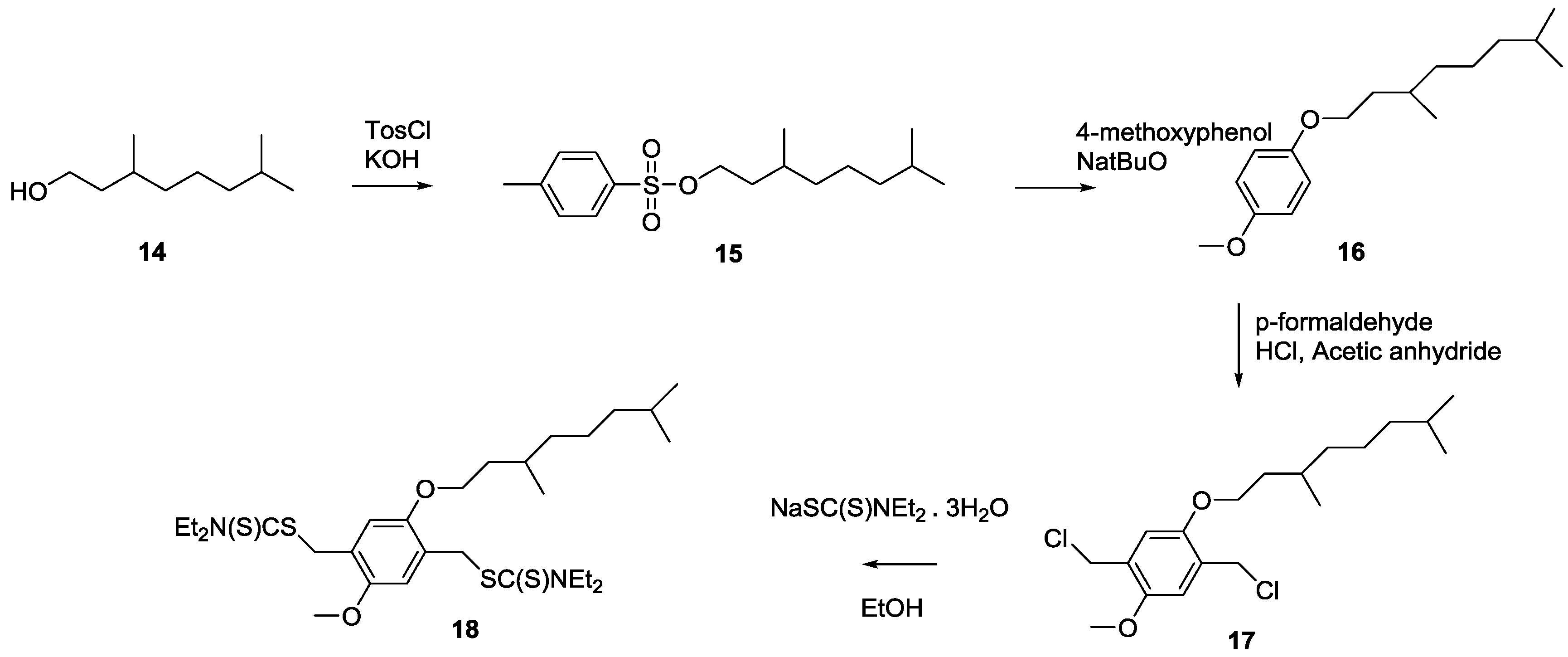 1.3.1. 2,5-Bis(N,N-diethyldithiocarbamate-methyl)-1-(3,7-dimethyloctyloxy)-4-methoxybenzene (18).