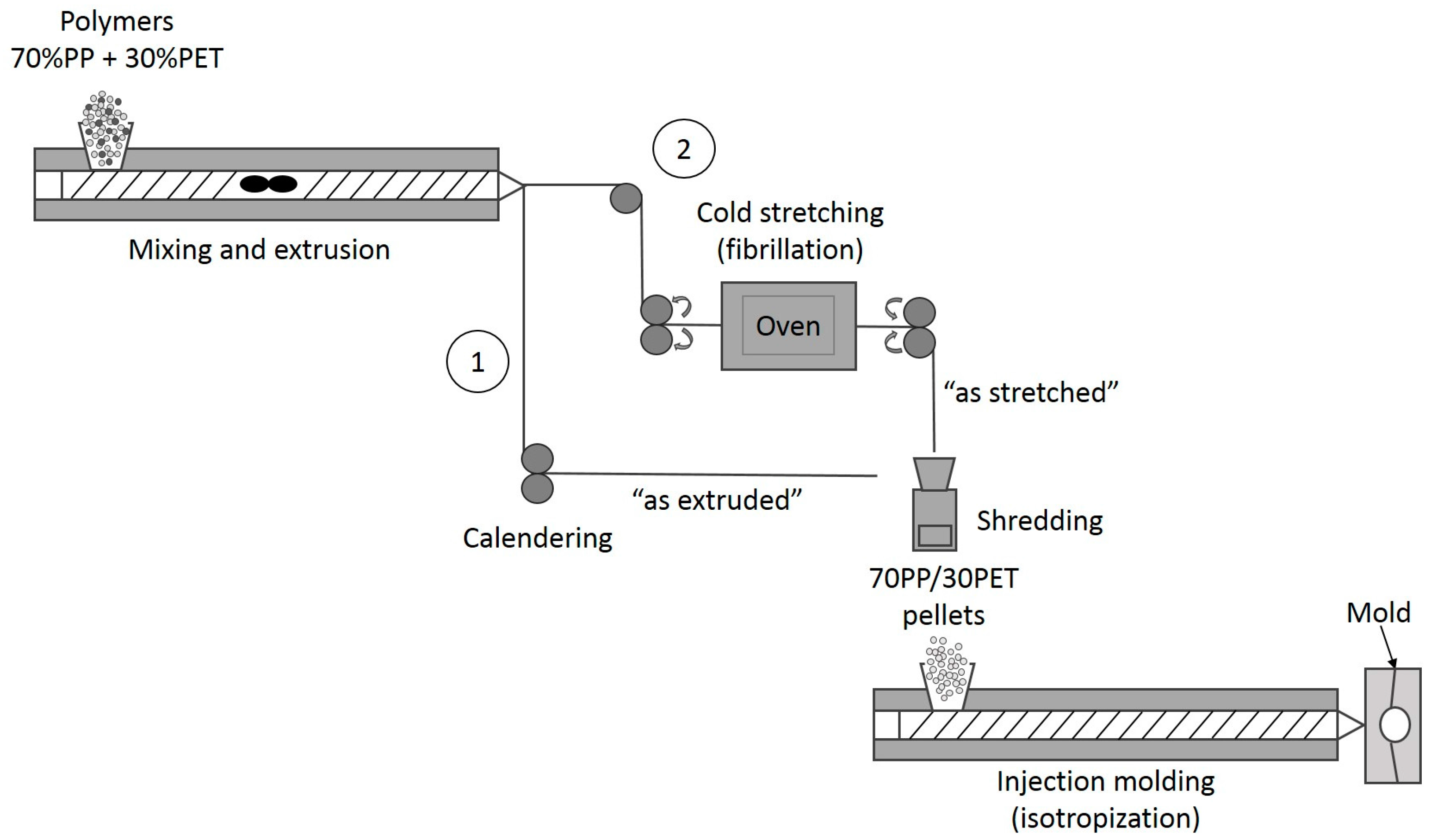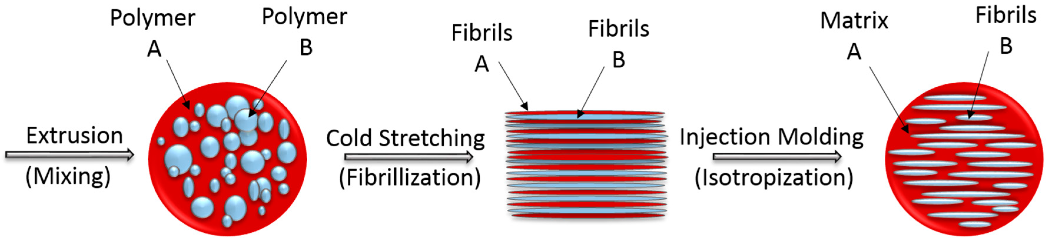 Two different approaches are often employed to avoid the drawbacks of this immiscibility. The first one consists in the addition of a compatibilizer to these blends. Mostly copolymers are used which can interact with both polymeric building components. When it is added to the mixtures, it will result in smaller dispersion of the second phase and better adhesion between the phases. Excellent mechanical properties of the materials could be achieved. In some cases, the compatibilized blends have obtained the tensile fracture behavior from brittle to ductile [21]. A second option is to transform the blends into microfibrillar composites (MFCs). MFC are an interesting class of composites where a high melting fibrillated polymer reinforces a lower melting matrix polymer by applying a specific processing sequence. They could be utilized in a wide range of applications because of improved mechanical properties such as strength and stiffness [12,15,16,22]. The manufacturing of MFCs consists of three basic steps (Figure 1):