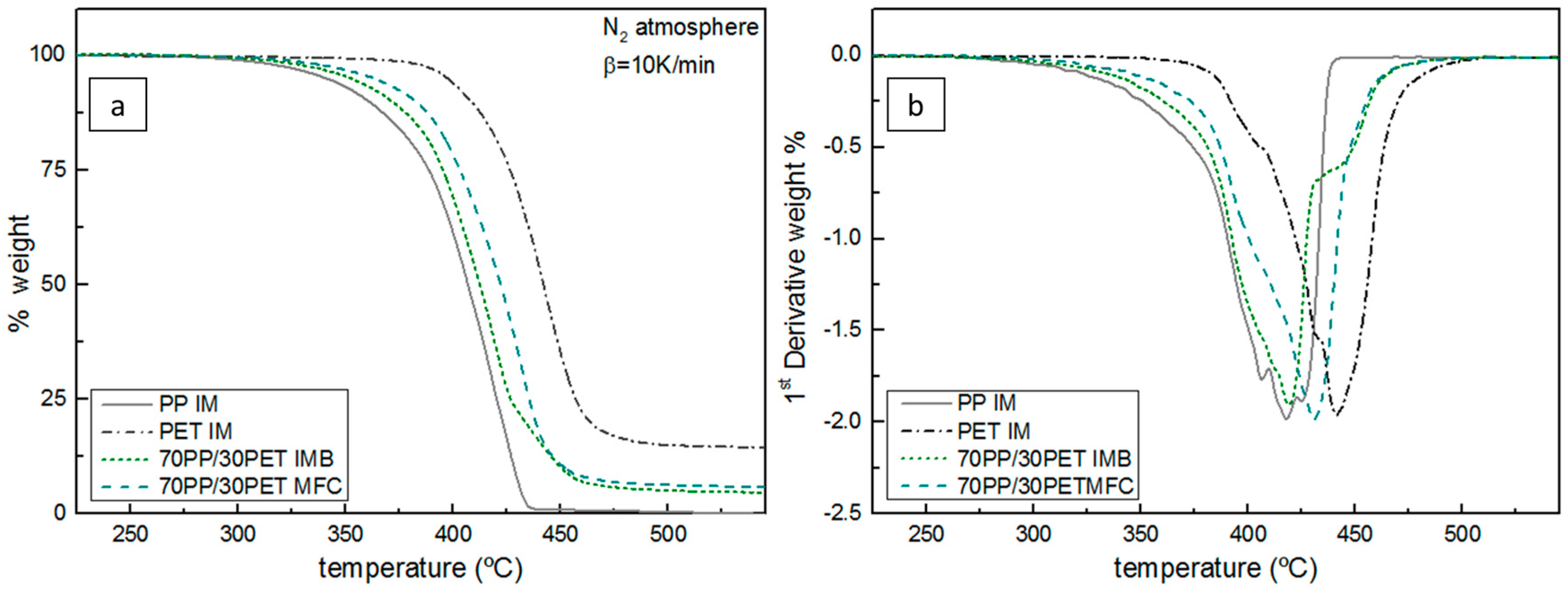 Thermogravimetric analyses of the samples were performed to investigate the degradation of PP and PET in IMB and MFC compared with virgin PP and PET. The results are shown in Figure 3a and summarized in Table 1. All samples show a single weight loss upon heating to 600 °C. The degradation step of PP was within the range of 342 to 436 °C with a limited char yield of 0.1% and for PET within 396 to 491 °C with a char yield of 14.5%. Those results are very consistent with literature [9,13,33]. The thermal degradation of PP does not imply chain branching or crosslinking [33], so the process started by thermal scission of C–C chain bonds [34]. As can be expected, if we compare the decompositions of PP and PET, it is obvious that PET has a higher thermal stability than PP. PET’s decomposition is initiated by scission of the ester group in the chain, yielding to carboxyl and vinyl ester groups, and eventually 14.5% of char residue remains. As the IMB and MFC contain a high amount of PET (30 wt %) the difference between the PP degradation and the other two is obvious. A delay in the onset temperature for IMB and MFC due the presence of the PET phase can be noticed. The higher temperature onset for MFC indicates the delayed degradation due to the formation of PET microfibrils. From the first derivative (dTG) of thermogravimetric (TG) curves represented in Figure 3b, can be seen that the presence of PET severely affects the degradation behavior of PP in both IMB and MFC. The degradation peaks for IMB and MFC were found at 419.1 and 430.8 °C, respectively. Due to the presence of PET in the fibril shape, the degradation of the blend is strongly affected, as the fibrils are prone to degrade slower than particles. Even after melting, orientation and alignment of fibrils can be maintained, since only temperature is applied during the test (no shear or mixing) so the alignment remains in the molten phase, which results in larger cohesion forces and later onset of degradation. Jayanarayanan et al. [13] elaborated that a high aspect ratio of PET microfibrils (five or eight) can shift the temperature onset of decomposition in MFC.