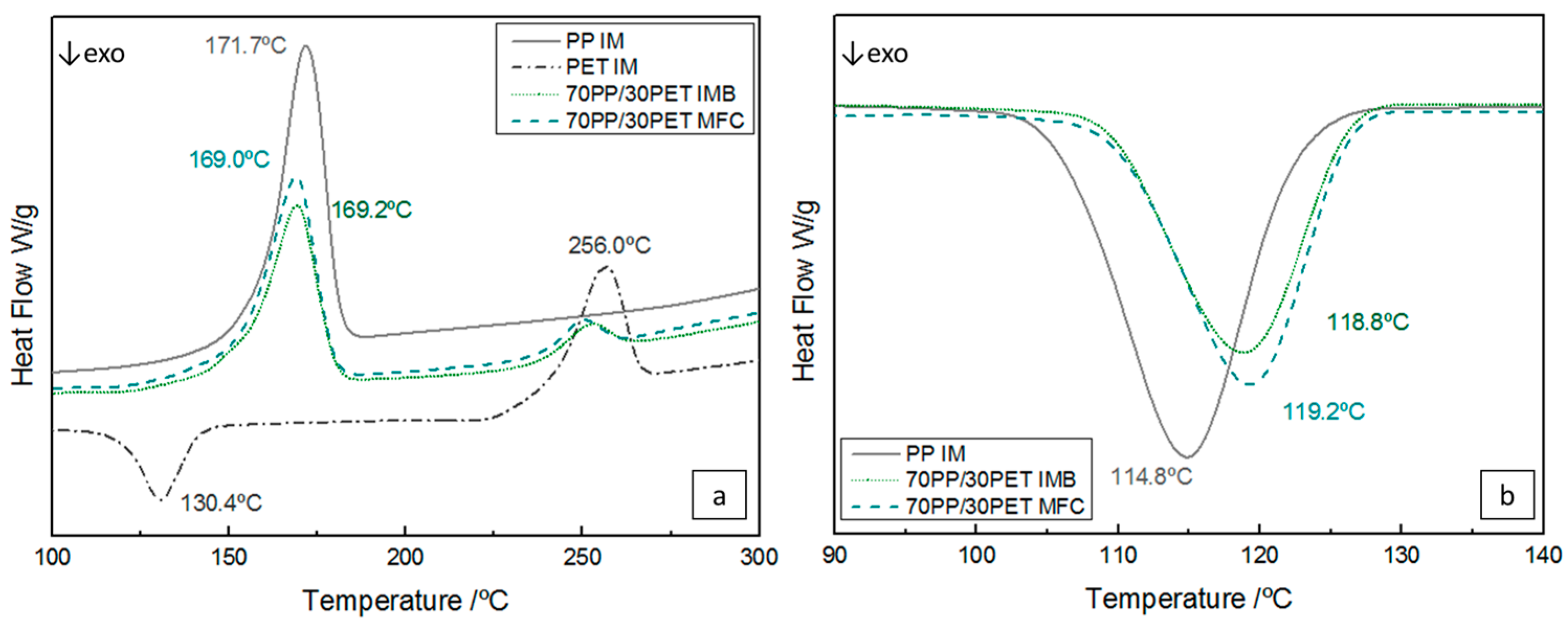 Figure 4a represents the DSC thermograms of the samples after injection molding. The temperature of 171.7 °C corresponds to the melting peak of the PP phase, during which time PET is still a crystalline solid, while the PP is in a high melting state. Analyzing the PET curve, a typical cold crystallization at 130.4 °C and the melting point at 256 °C were found. Comparing the Tm for IMB and MFC with pure PP, a decrease in temperature can be found, still with a single melting peak of PP, which confirms the presence of α-crystalline modification. The crystallization temperature of neat PP is around 114 °C, but in IMB the PET phase-shifted Tc of PP to the higher levels ~120 °C (Figure 4b). PP crystals become imperfect due to the presence of the PET phase, which means a lower spherulite size of PP and a higher number of spherulites. Therefore, the result is a decrease of the melting temperature of PP and an enhanced crystallization. In the case of MFC the same effect is noted, which indicates that PET in situ microfibers had a significant nucleating effect on the crystallization of the PP phase due to the higher surface-to-volume ratio. Similar results have been described by other authors [6,8,13,35,36].