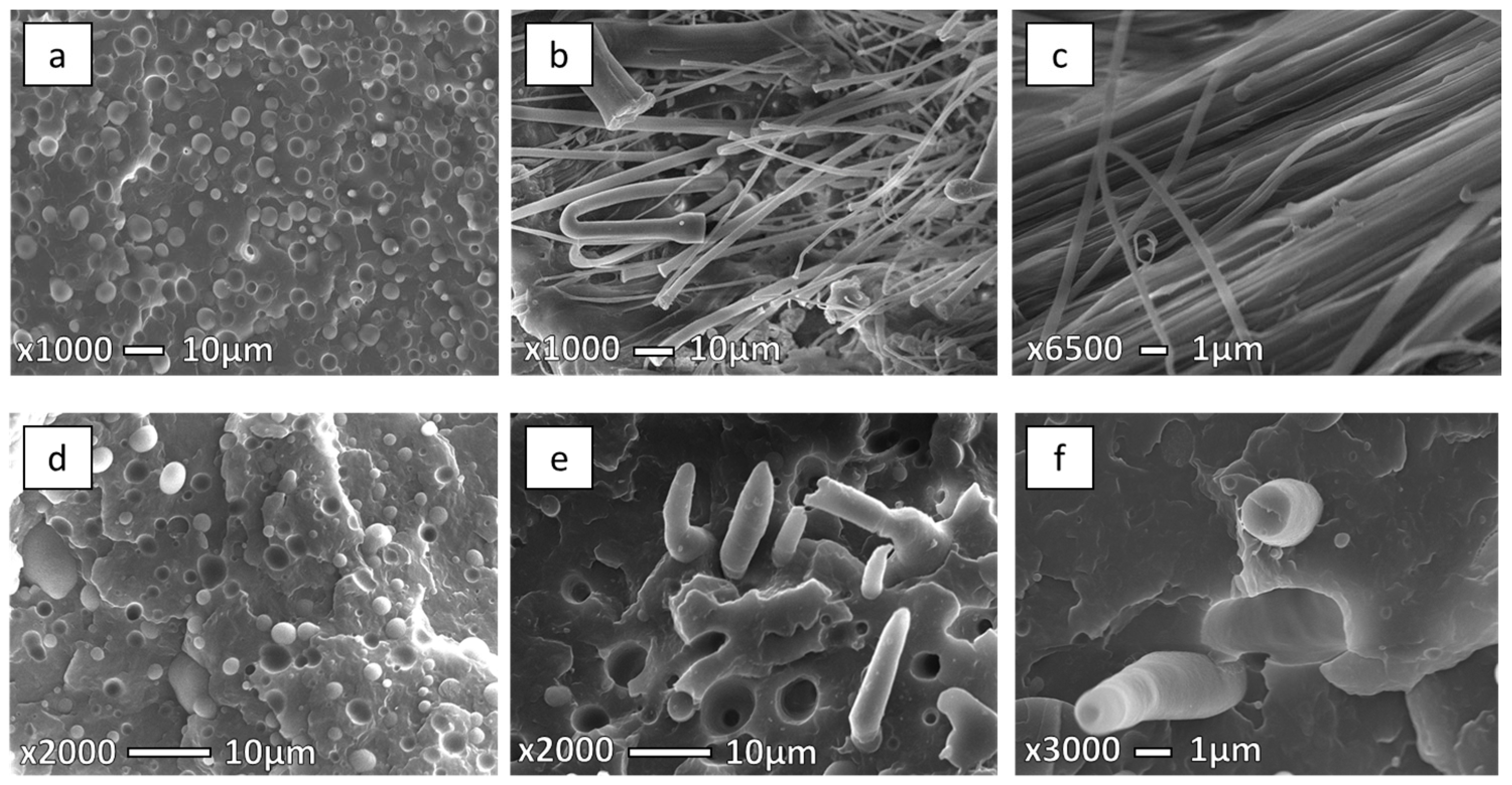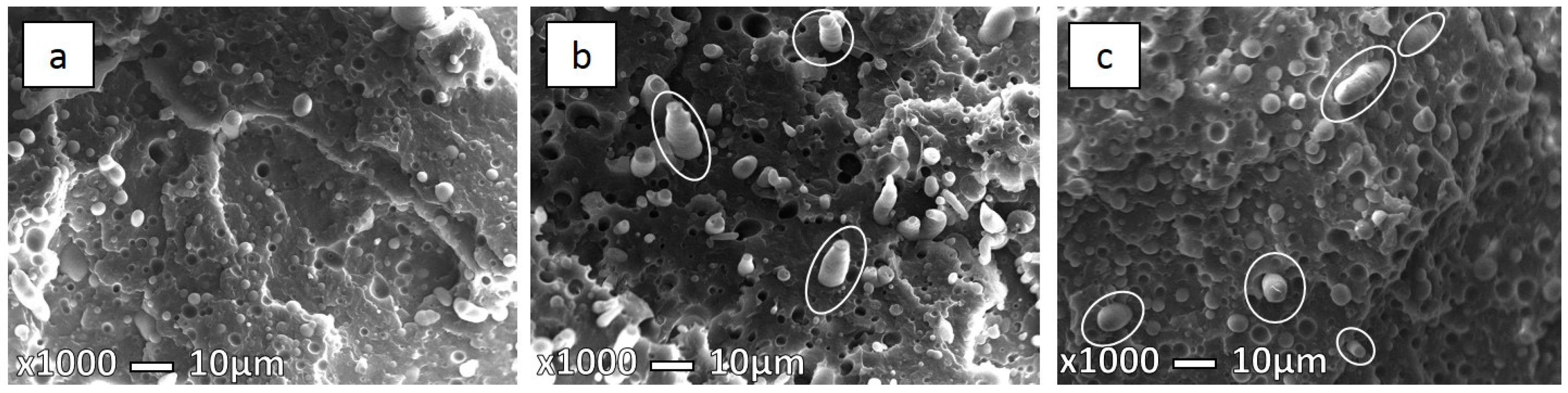 IMBs and MFCs were injection molded at three different injection molding temperatures of 210, 230, and 280 °C. Figure 6 shows the different morphologies of the IMBs at different Tim. All prepared IMBs and MFCs, either low or high Tim show typical incompatible morphology. At 230 and 280 °C (Figure 6b,c), some larger elliptical particles occur, which could be mistaken for microfibrils, but contrary to microfibrils they have uneven cross-sections. Several PET particles have made new single daughter particles, ellipsoids which, from the obtained observation, could be mistaken for fibrils, but it is known that blend morphology does not display these structures. This phenomenon is known as a coalescence effect. Under the effect of coalescence, the merging of two or more particles into one new larger particle which is often not spherical in shape is implied [25]. During the injection molding process at higher temperature there is a significant possibility for deformation and coalescence of PET particles and fibrils [13,14,24,25,30,38,39,40,41,42,43,44,45].
