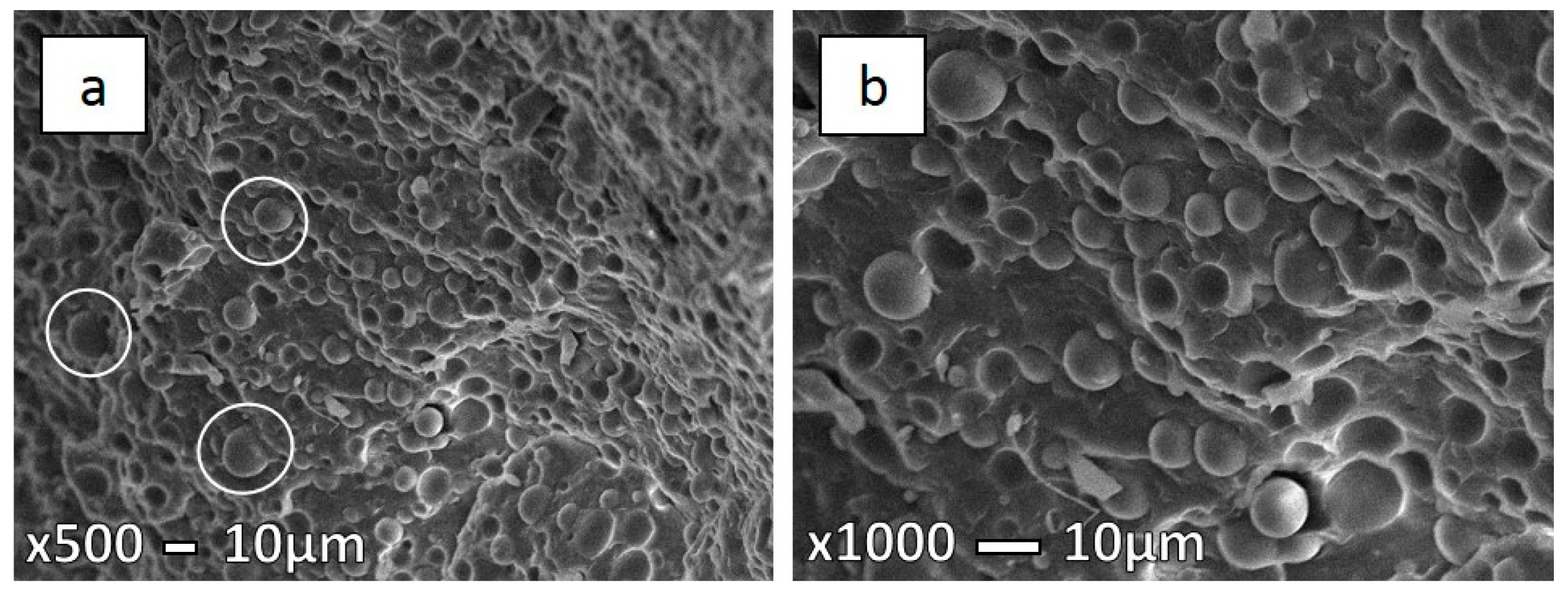 The impact energy for the IMB samples at the lowest Tim has the highest value. This is probably due to the smaller particle size. According to the measured diameters listed in Table 3, there is no significant difference in the average particle size for IMB samples at 210 and 230 °C but, looking into the morphology, there was found a more uniform dispersion of the small PET particles in the case of 210 °C, while the sample at 230 °C shows a distribution of the higher particle diameter. Moreover, in Figure 6b, some collapsed elliptical particles are noticeable which can reduce the final mechanical properties.
