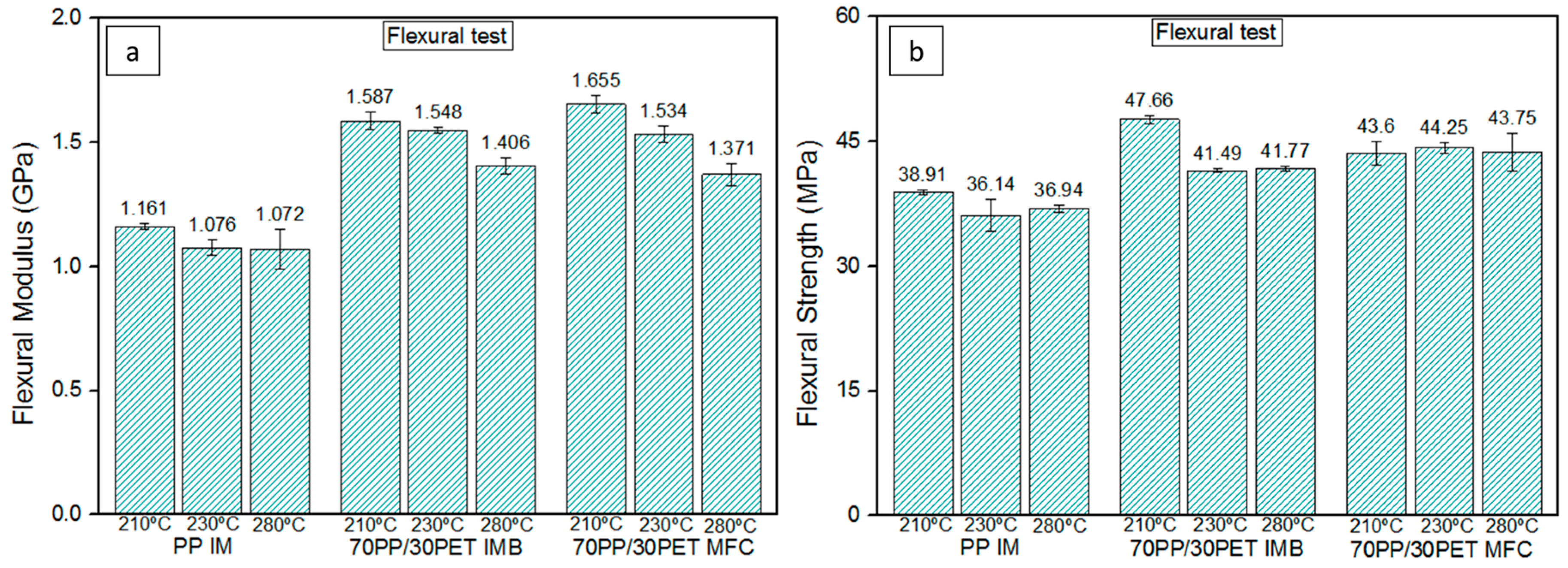 Comparison of flexural properties of PP IM, 70PP/30PET IMBs, and 70PP/30PET MFCs at three different Tim (a) flexural modulus; (b) flexural strength.
