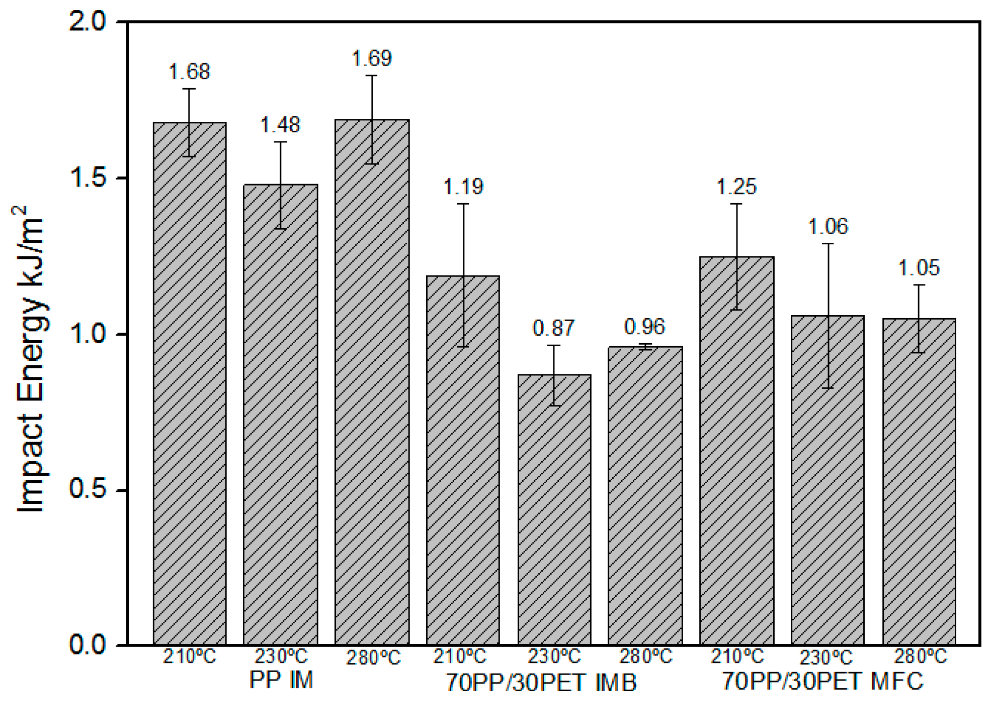 In Table 4 the results obtained for samples made at 210 °C are listed. The impact energy for both PP/PET IMB and MFC was lower than for neat PP and PET. This is due to the incompatibility between PP and PET and the occurrence of phase separation [6,38]. MFC showed a slight increase of 8% in comparison with IMB (p = 0.057) for the impact energy. The reason of the enhanced impact properties in MFC, as explained by some authors [17,29,48], probably lies in the presence of PET fibers which are more resistant to crack propagation. Perkins et al. [48] explained that impact resistance can vary depending on the degree of crystallinity. In our case PET fibers reinforce the individual PP spherulites. As it has been mentioned earlier, the PP crystals become imperfect and smaller, which may increase the impact strength. Both the size and amount of PP spherulites play an important role and, together with the interfacial adhesion between the oriented PET fibers and the PP matrix, will determine the impact strength.