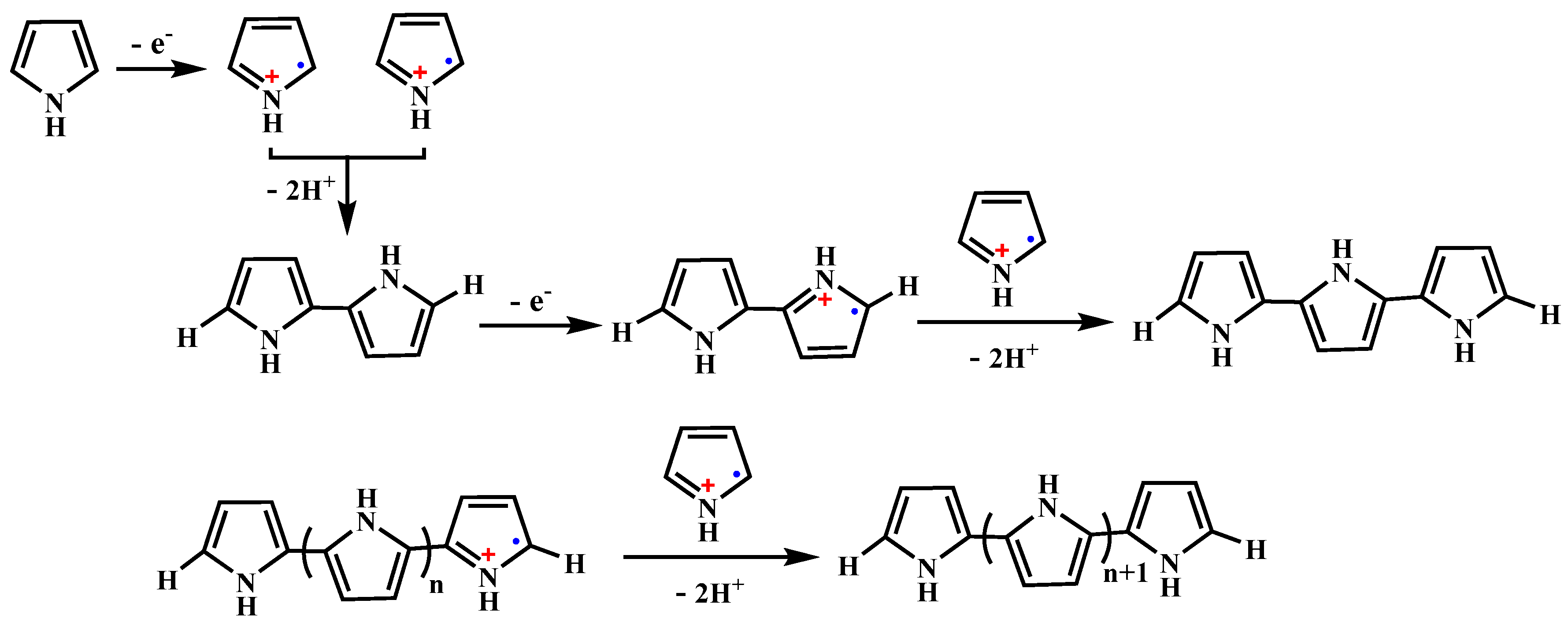 - Tan, Y.; Ghandi, K. Kinetics and mechanism of pyrrole chemical polymerization. Synth. Met. 2013, 175, 183–191. [Google Scholar] [CrossRef]