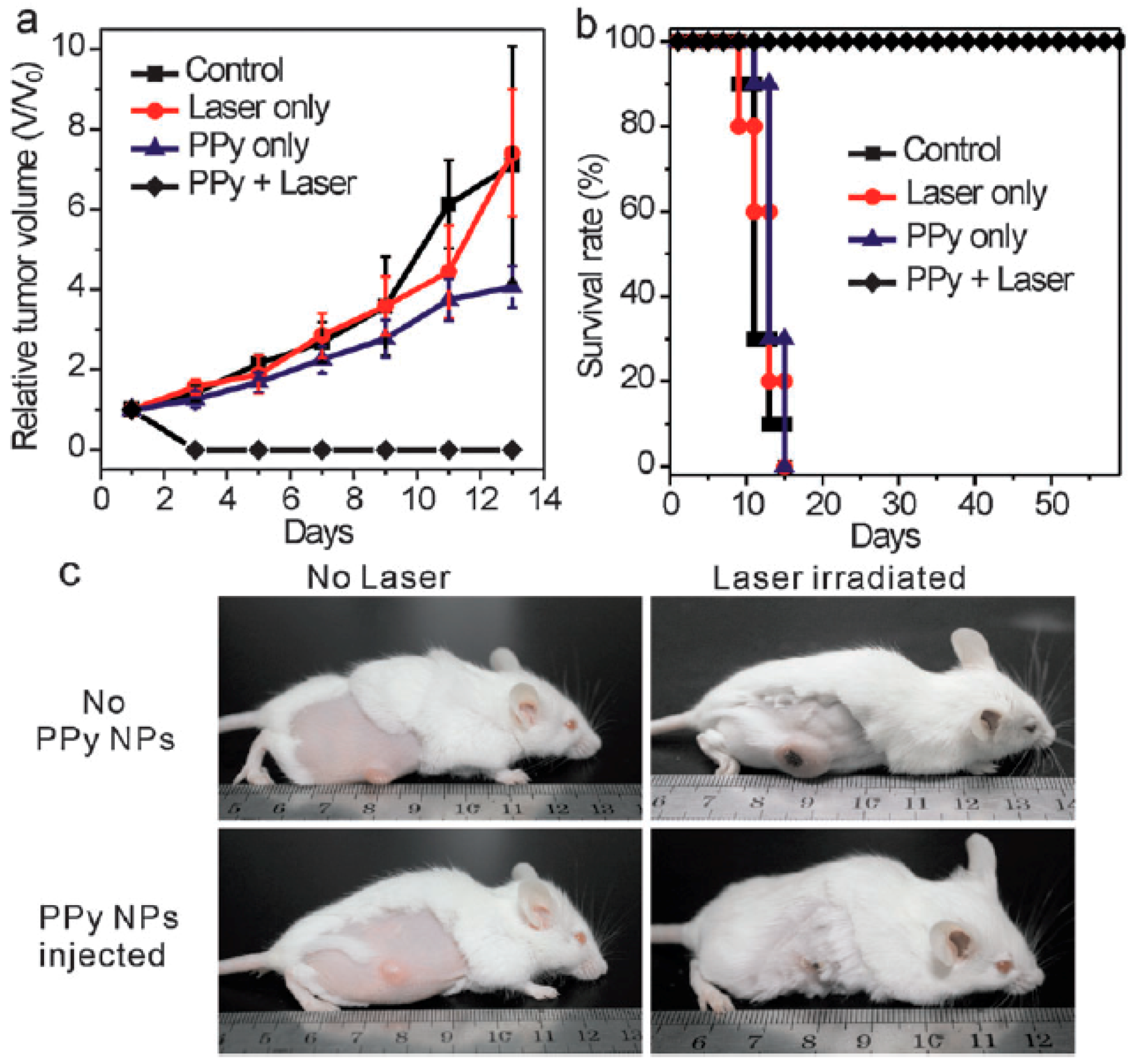 In vivo photothermal therapy study using intravenously injected PPy NPs. (a) Tumor growth rates of groups after different treatments; (b) Survival curves of mice bearing 4T1 tumor after various treatments; (c) Representative photos of tumors on mice after various treatments (only laser treated and PPy + laser treated). Reproduced with permission from [87].