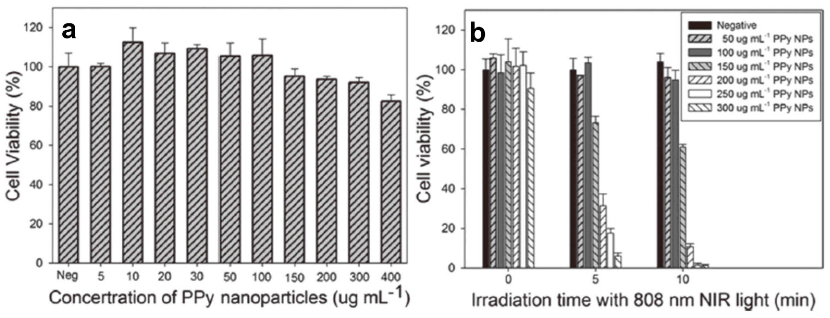 (a) Cell viability of HUVECs (human umbilical vein endothelial cells) with 24 h exposure to various concentrations of PPy NPs; (b) Cell viability of HeLa cells after treatment with different concentrations of PPy NPs and different NIR laser irradiation time. Reproduced with permission from [92].