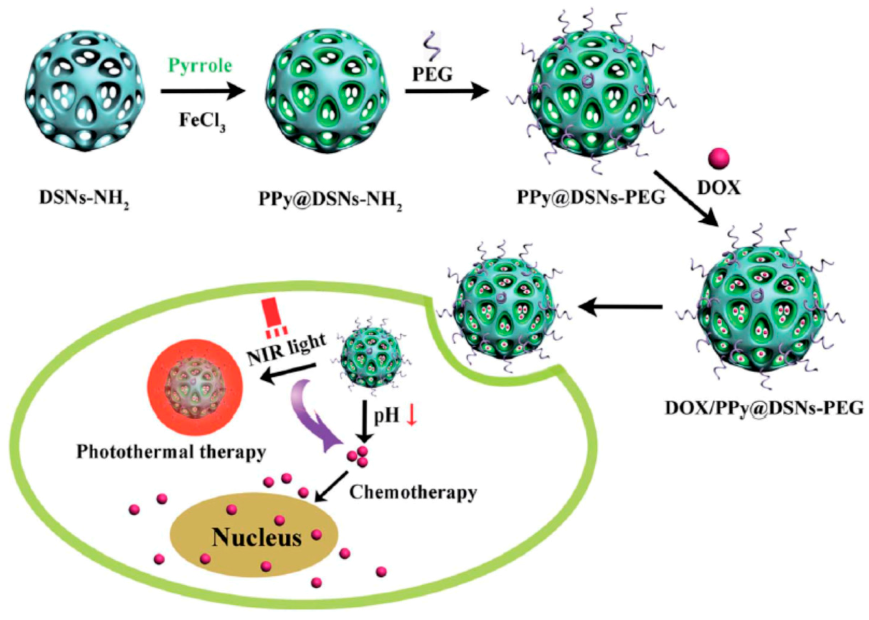 Schematic illustration of the preparation of DOX/PPy@DSNs–PEG for combined chemo-photothermal therapy. Reproduced with permission from [102].