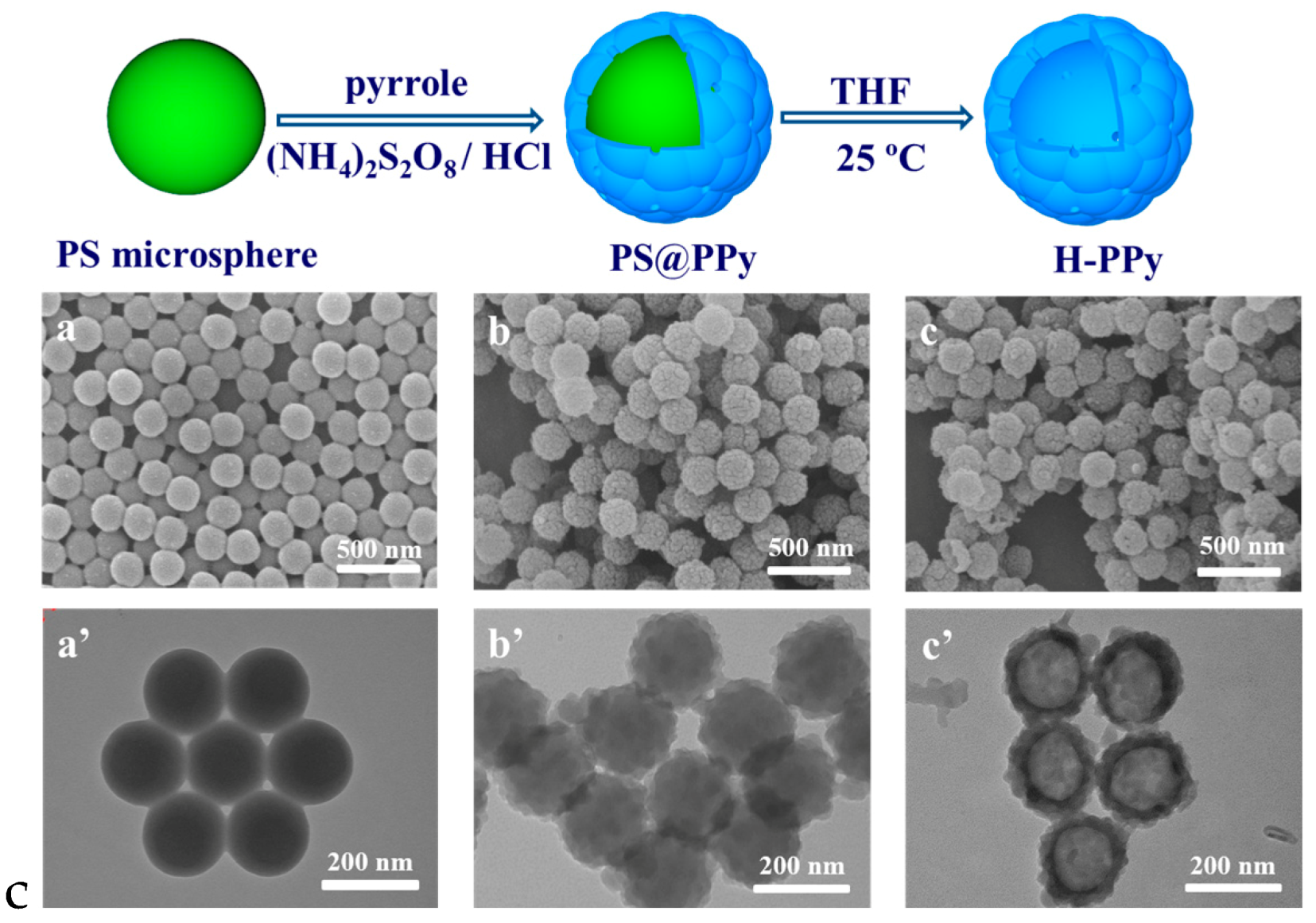 Schematic illustration of the synthesis of H-PPy microspheres. The SEM and TEM images of PS microspheres (a,a’), PS@PPy microspheres (b,b’), and H-PPy microspheres (c,c’). Reproduced with permission from [103].