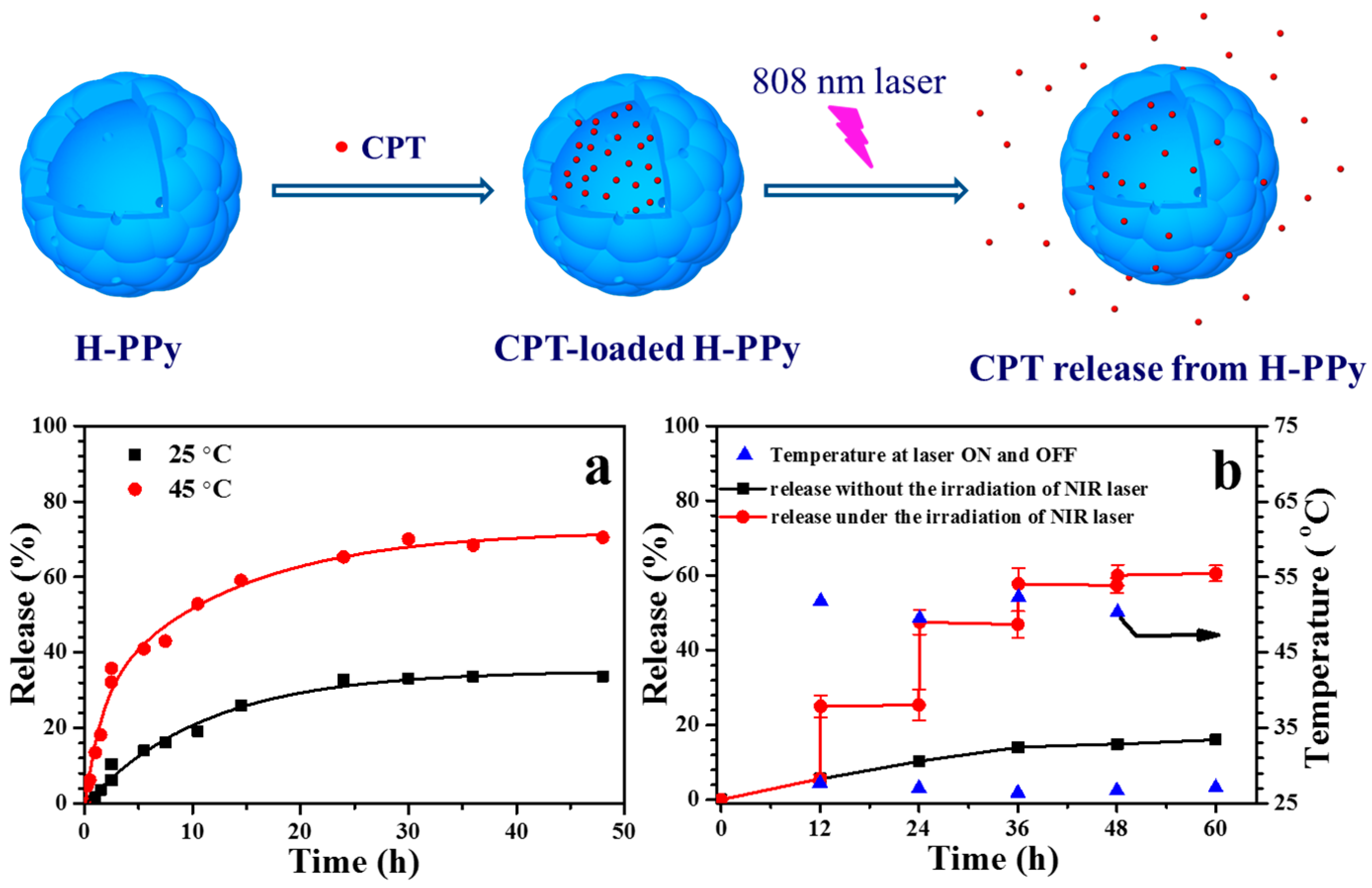 Schematic illustration of the loading and NIR-laser-triggered release of camptothecin (CPT) in H-PPy microspheres. (a) The releaseprofiles of CPT from H-PPy microspheres dispersed in the aqueous solution of DMSO (5% v/v) at 25 and 45 °C; (b) The release profile of CPT from H-PPy microspheres dispersed in the aqueous solution of DMSO (5% v/v) (0.1 mg·mL−1) under NIR laser (808 nm, 3.3 W·cm−2) irradiation for 5 min with an ON/OFF-mode every 12 h (-●-, left ordinate), and the corresponding temperature of the dispersion at every ON and OFF point (-▲-, right ordinate). As a control, the release profile of CPT in the same dispersion without NIR laser irradiation is also listed (-■-, left ordinate). Reproduced with permission from [103].