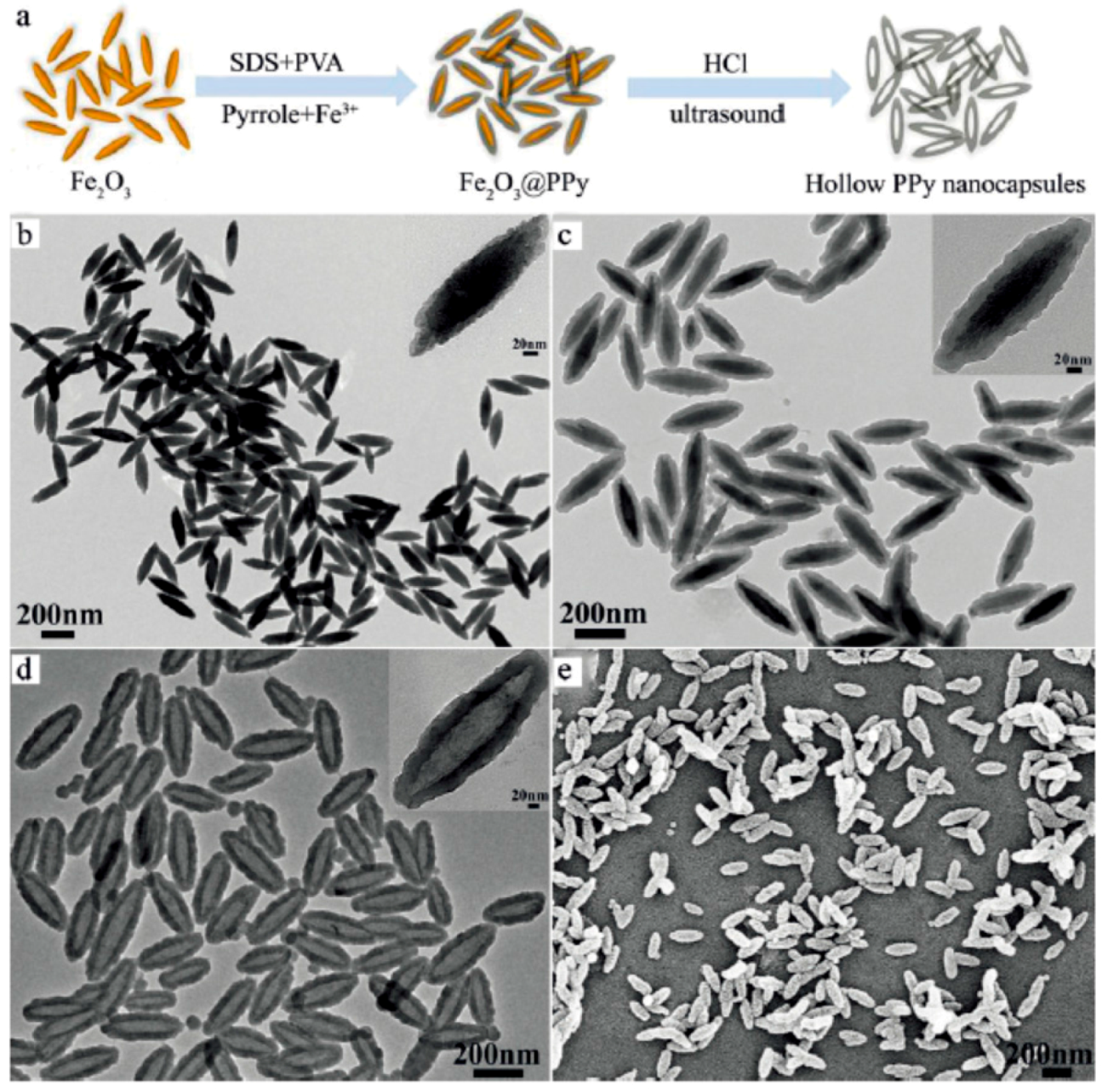 Schematic procedure for the synthesis of spindle-like PPy HNCs in (a) an aqueous solution; TEM images of (b) Fe2O3; (c) Fe2O3@PPy; and (d) PPy HNCs; SEM image of (e) PPy HNCs. Reproduced with permission from [104].