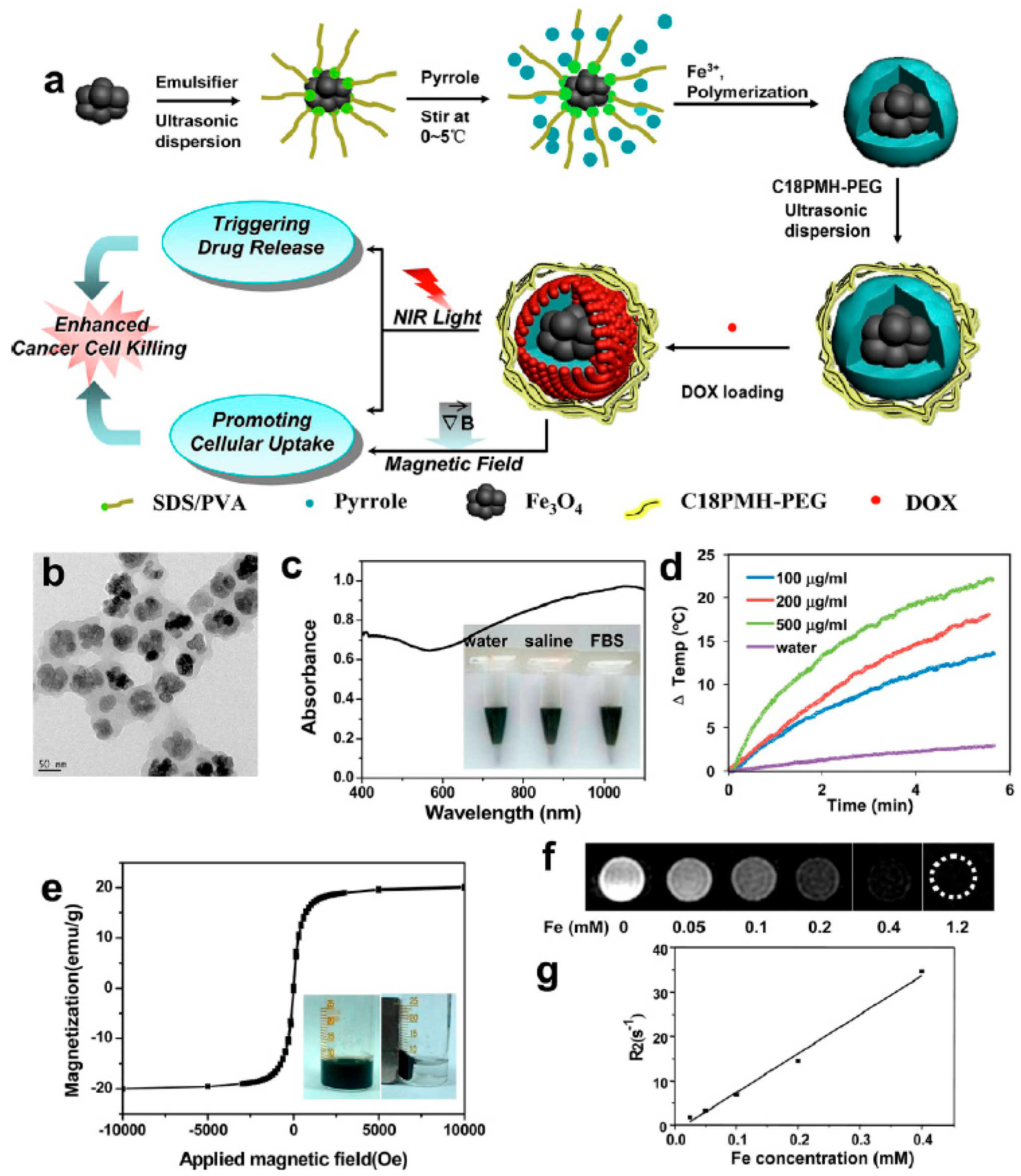 Preparation and characterization of Fe3O4@PPy–PEG nanocomposite. (a) Schematic illustration to show the synthesis of Fe3O4@PPy–PEG nanoparticles, the subsequent drug loading, and the remotely controlled cancer cell killing under dual physical stimuli. (b) TEM image of the synthesized Fe3O4@PPy–PEG nanoparticles; (c) UV–vis–NIR extinction spectra of Fe3O4@PPy–PEG nanoparticles in water (100 μg·mL−1). Inset: Photo of Fe3O4@PPy-PEG nanoparticles in different solutions including water, saline, and fetal bovine serum (FBS); (d) Temperature elevation of water and Fe3O4@PPy–PEG solution of different concentrations over a period of ~5.5 min under exposure of NIR light (808 nm, 0.75 W·cm−2) measured every 0.15 s using a digital thermocamera; (e) Field-dependentmagnetization loop of the Fe3O4@PPy–PEG sample. The absence of a hystersis loop suggested the superparamagnetic property of Fe3O4@PPy-PEG. Inset: Photos of Fe3O4@PPy–PEG solutions in the absence and presence of a magnet field; (f,g) T2-weighted MR images of the nanocomposite recorded using a 3 T MR scanner revealed a concentration-dependent darkening effect, showing a high transverse relaxivity (r2) of 87 mM−1·s−1. Reproduced with permission from [105].