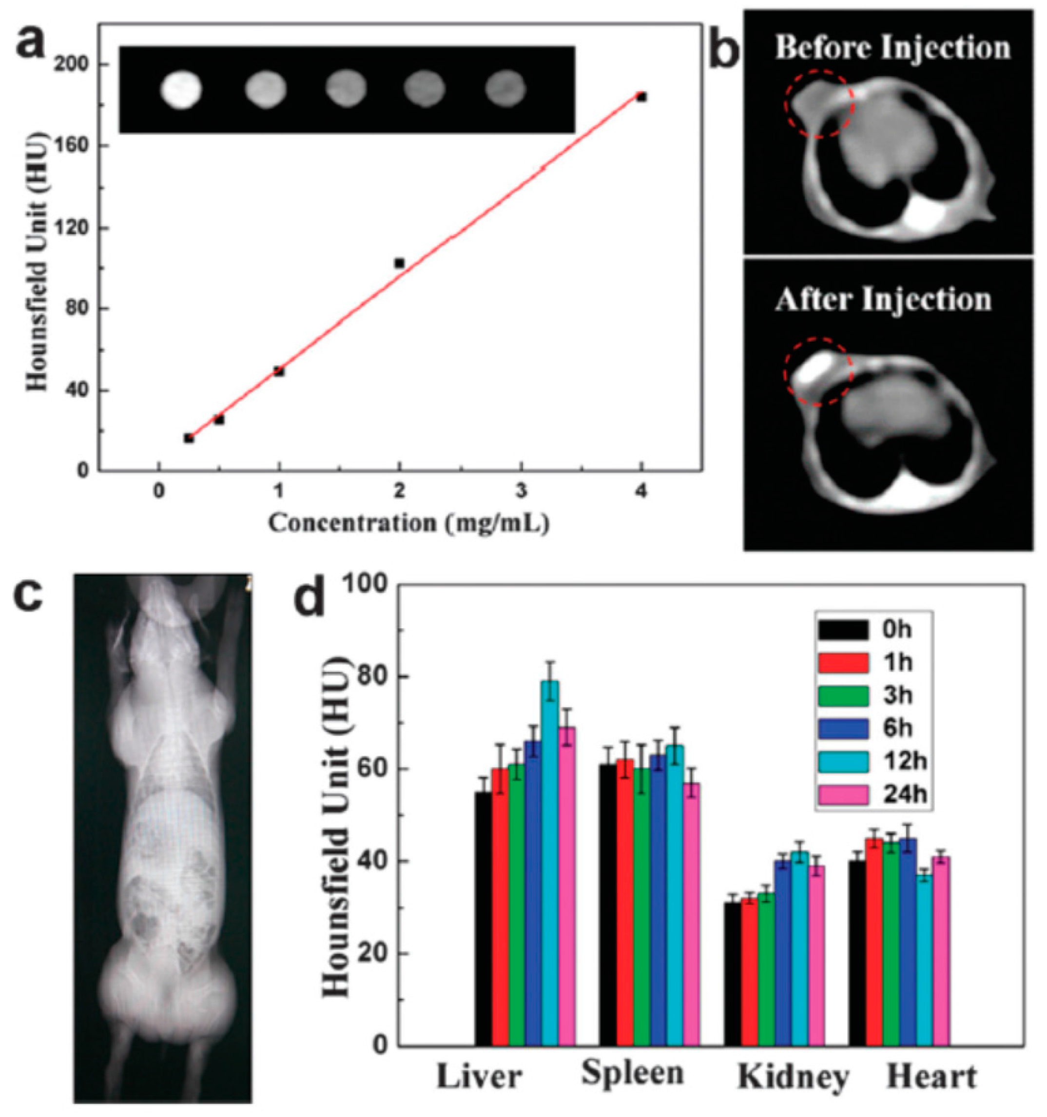 In vitro and in vivo evaluation of CT imaging efficiency of ZPs. (a) CT values and images (inset) of ZPs with different concentrations; (b) In vivo CT imaging of mice model before and post injection; (c) CT image of the whole mini swine model; (d) CT values of liver, spleen, kidney and heart of mini swine at different time points before and post injection. Reproduced with permission from [118].