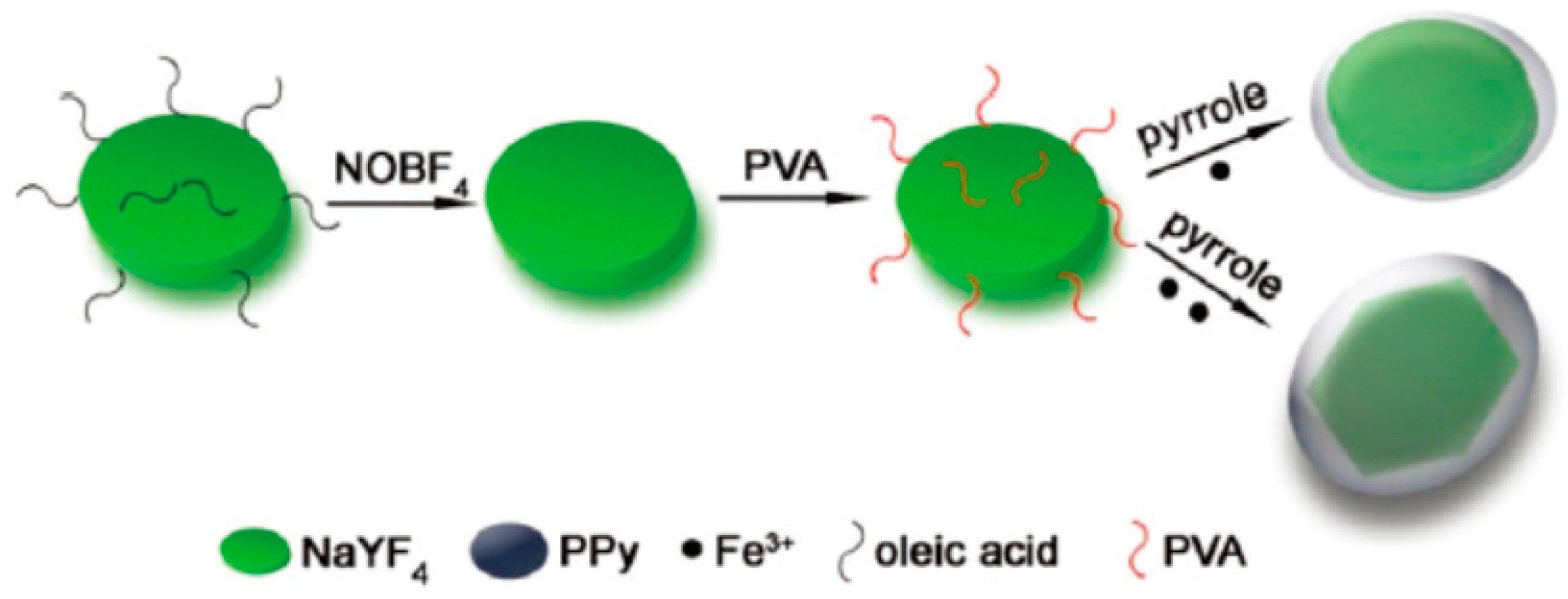 Schematic illustration of the synthetic route of NaYF4:Yb/Er@PPy core–shell nanoplates. Reproduced with permission from [119].