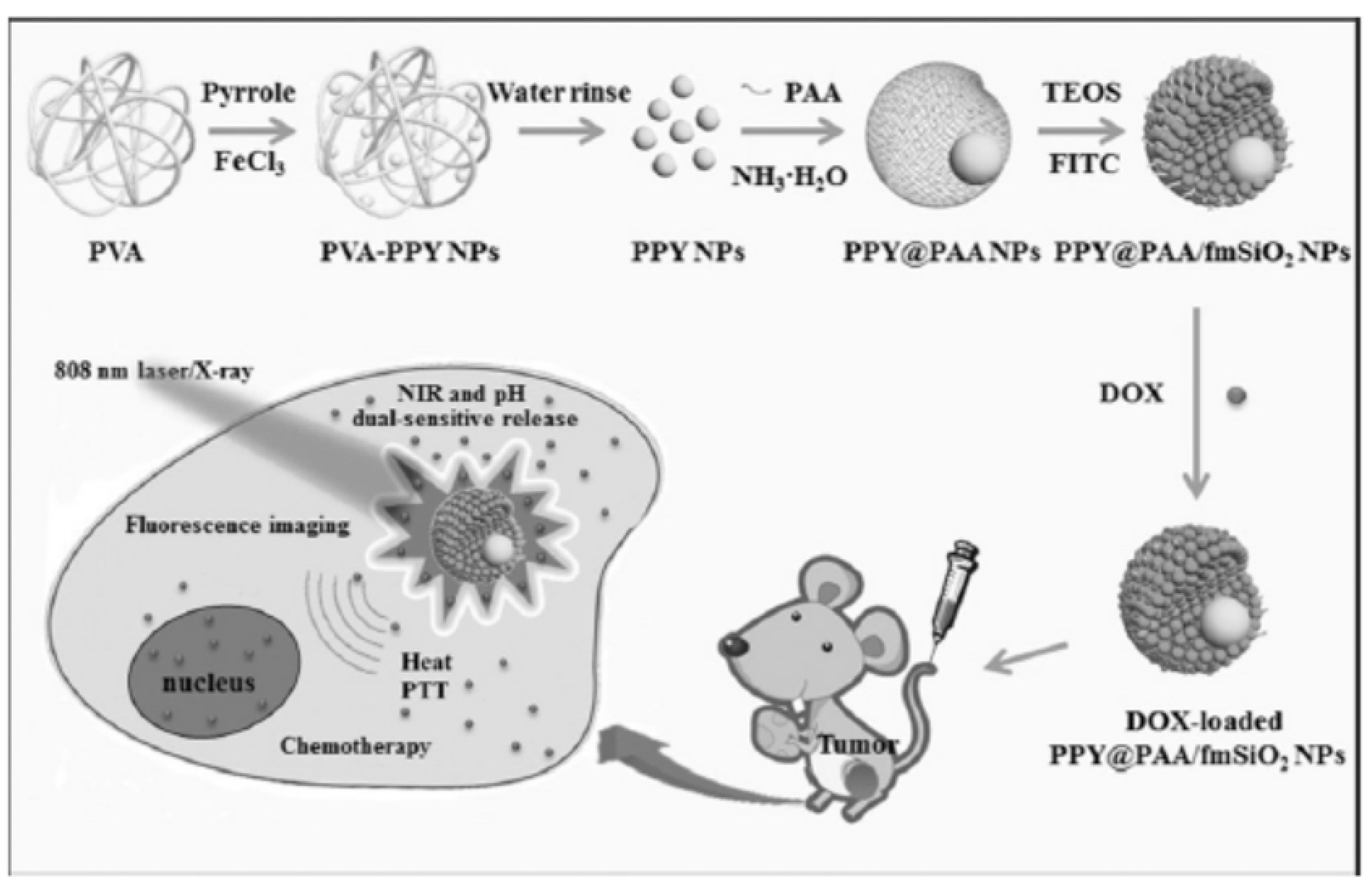 Schematic illustration for the synthesis of the multifunctional PPY@PAA/fmSiO2 NPs as NIR light and pH dual-stimuli responsive drug vehicles for fluorescence imaging and chemo-photothermal synergistic cancer therapy in vitro and in vivo. Reproduced with permission from [121].