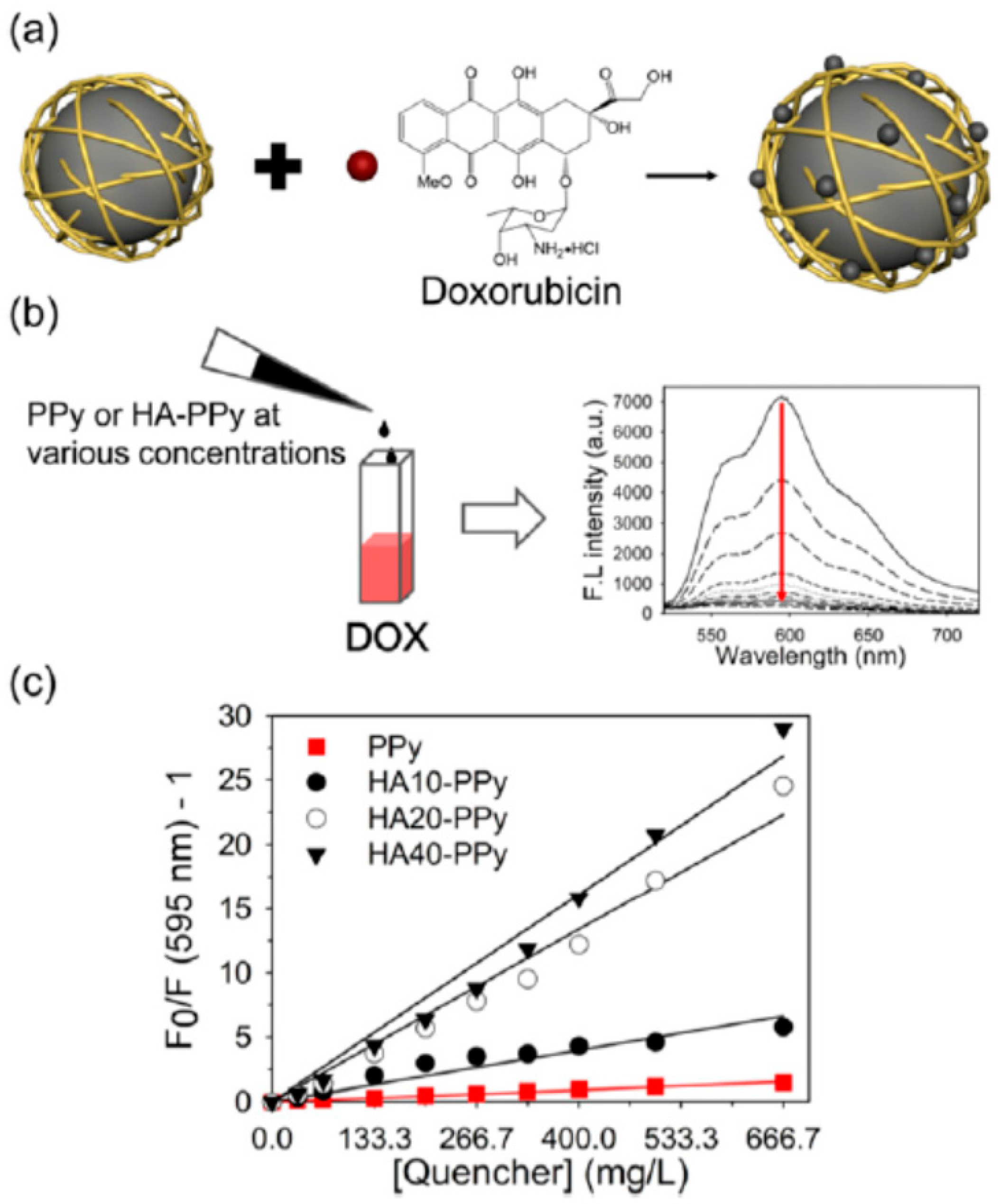 Fluorescence quenching of DOX by PPys and HA–PPys. (a) Illustration showing the formation of a complex between a nanoparticle and DOX, and the subsequent fluorescence quenching of DOX; (b) Fluorescence spectra of DOX solution (10 μg in 100 μL deionized water) mixed with HA–PPys at various concentrations (from top to bottom: 0, 10, 20, 40, 60, 80, 100, 120, 150, and 200 μg in 200 μL); (c) Stern–Volmer plots demonstrating the quenching of DOX fluorescence by HA–PPys. Ksv of PPys (■), HA10-PPys (●), HA20-PPys (∘), and HA40-PPys (▼) was calculated to be 2.3, 9.9, 33.4, and 40.2 mL·mg−1, respectively. Reproduced with permission from [122].