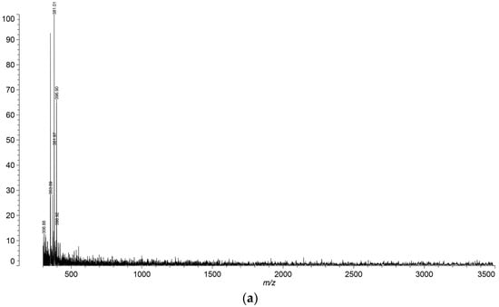 Sodium alginate powder (0.5%, w/v) was dissolved in deionized water by stirring (RW 20 digital, IKA®-Werke GmbH & Co. KG, Staufen, Germany) at 350 rpm for 24 h. Similarly, 0.5% of chitosan solution (w/v) was prepared in a 1% solution of lactic acid (v/v). Pure sodium alginate (ALG) solution (0.5% w/v) and pure chitosan (CH) solution (0.5% w/v) were reference samples and were used to produce a sodium–alginate polyelectrolyte complex (ACH). Polycation and polyanion solutions (v/v) were mixed in different volume ratios and homogenized (T18 basic, ULTRA TURRAX, IKA®-Werke GmbH & Co. KG, Staufen, Germany) for 1 min in the proportions described in Table 1. At the end of the homogenizing process, the glycerol was added as a plasticizer (30% of dry weight of used polysaccharide) to sodium alginate–chitosan blends and their references. Finally, the composition was degassed using sonification to form bubble-free solutions. The pH of the obtained ALG, CH, and ACH hydrosols was measured. Hydrosols were used as film-forming solutions and tested for MALDI-TOF analysis.