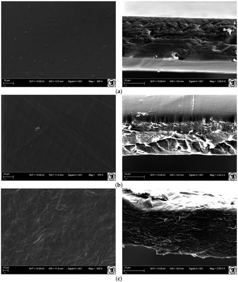 Morphologies of the prepared materials were characterized using an EVO LS15 (Zeiss, Oberkohen, Germany) with an accelerating voltage of 20 kV. All specimens were frozen in liquid nitrogen and broken into pieces to expose the cross-section region of coatings. Then samples were dehydrated in graded ethanol solutions before applying critical point drying. The samples were dried using an E3100 Critical Point Dryer (Quorum Technologies, Ltd., West Sussex, UK). The SEM observations were performed after spattering the samples with gold for short bursts totaling 140 s, to avoid coating heating, using a sputter coater Scancoat 6 (Edwards, London, UK).