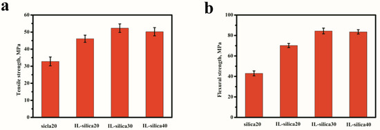 Figure 5 exhibits the mechanical properties of epoxy composites with different IL-silica loading. Compared with u-silica20/epoxy composites, the tensile strength, flexural strength, flexural modulus, and impact strength of IL-silica20/epoxy composites increased from 32.8 MPa, 43.0 MPa, 1.57 GPa, and 7.8 kJ·m−2 to 46.1 MPa, 70.2 MPa, 2.13 GPa, and 16.4 kJ·m−2. The improvement is due to the uniform dispersion of fillers and chemical bonds at the matrix/filler interface via polymerization of epoxy resin with the active imidazole groups of IL-silica. The reinforcement effect of polymer composites largely depends on the efficiency of load transfer at the interface [29,30]. In the present epoxy network, IL-silica served as a linker for epoxy polymer chain. This can efficiently improve the interactions between epoxy matrix and the silica filler. The uniform dispersion of IL-silica and improved interfacial interaction are favorable to enhance the load transfer from epoxy matrix to silica filler, and thus significantly increase the mechanical properties [31,32]. By using 30 phr IL-silica in epoxy composite, tensile strength increased from 46.1 to 52.3 MPa, flexural strength from 70.2 to 84.4 MPa, flexural modulus from 2.13 to 2.32 GPa, and impact strength from 16.4 to 19.2 kJ·m−2. A further increase in IL-silica content (up to 40 phr) generated a slight decrease of mechanical properties. This can be explained by the agglomeration of IL-silica in high content.