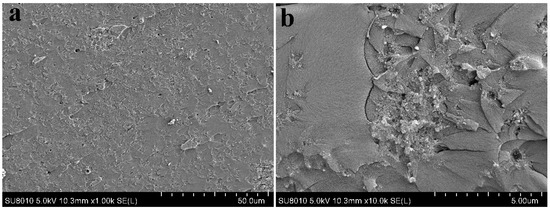Figure 8 presents the representative morphologies of the fractured surfaces of epoxy composites. From Figure 8a,b, the u-silica is present in the form of agglomerates in the epoxy matrix due to the formation of hydrogen bonds among abundant silanol groups, which partially offsets the reinforcement effect on mechanical properties. In case of IL-silica/epoxy composites, most of the silanol groups have been reacted and the surface has been changed from hydrophilic to hydrophobic, thus the agglomeration tendency would be reduced. As shown in Figure 8c,d, the absence of obvious aggregates on the fractured surface confirms the more uniform dispersion of IL-silica in epoxy resin than u-silica. Clearly, the IL-silica is embedded well into and tightly bound to the epoxy matrix. Additionally, in Figure 8c,d, large and elongated crack patterns confirm higher crack growth resistance of IL-silica/epoxy composite, which facilitates energy dissipation and increases the fracture toughness [38]. These characteristics are consistently associated with the increased interfacial adhesion and efficient transfer of the load in IL-silica/epoxy composites.