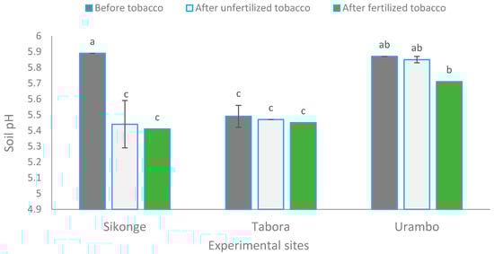 Furthermore, the results of this study showed significant interactions between sites and fertilizer application on soil pH. The pH of Sikonge soils significantly reduced from 5.89 before the experiment to 5.44 and 5.41 after unfertilized and fertilized tobacco harvesting, respectively. Soil pH for Tabora was not affected significantly by tobacco cultivation and fertilization when compared with measurements taken before the field experimentation. At the Urambo site, the soil pH was reduced significantly by the fertilization (Figure 1). This reduction in soil pH could be due to the H+ generated by nitrification and the acidification effects caused by the nicotine released by tobacco roots.