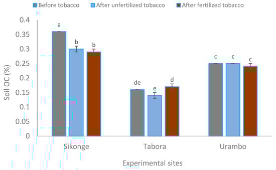 The organic carbon (OC) for Sikonge, Tabora, and Urambo were significantly different across the sites. The higher OC value was recorded in Sikonge (0.32%) followed by Urambo (0.25%) and Tabora (0.15%). The OC in the soil decreased significantly by planting tobacco and supplying fertilizers (Table 2). For instance, there was a significant reduction in OC content from 0.25% to 0.23% by just cultivating tobacco and fertilizing tobacco with N10P18K24 and CAN 27%. Furthermore, significant interactions were observed between sites and cultivating tobacco and fertilizer application. OC for Sikonge was significantly higher than in the other two sites, probably due to variation in soil particles. The lowest organic matter content was reported in Tabora and followed by Urambo (Figure 2).