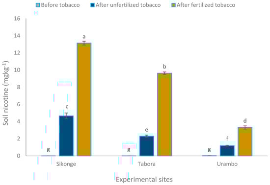 Soil nicotine for Sikonge, Tabora, and Urambo were significantly different across the sites (Figure 3). The highest soil nicotine of 5.93 mg kg−1 was observed in Sikonge, followed by Tabora (3.97 mg kg−1) and Urambo (1.51 mg kg−1). Before the establishment of tobacco, soil nicotine was negligible (0.01 mg kg−1). However, after harvesting unfertilized tobacco, the soil nicotine increased to 2.71 mg kg−1. Upon tobacco fertilization with NPK and CAN, nicotine in soil increased significantly (p < 0.001) to 8.69 mg kg−1. Results showed significant interactions among sites and fertilizer application on soil nicotine. The highest increase of nicotine was observed in the Sikonge soil, with an increase from 0.01 mg kg−1 to 4.66 and 13.13 mg kg−1 for unfertilized and fertilized tobacco soils, respectively. Soil nicotine for Tabora soil increased from 0.01 mg kg−1 to 2.29 and 9.63 mg kg−1 for unfertilized and fertilized tobacco soils, respectively. The lowest increase of nicotine in soils observed in Urambo with an increase from 0.02 to 1.19 and 3.31 mg kg−1 for unfertilized and fertilized tobacco soils, respectively (Figure 3). Therefore, there was more nicotine in the soil following the fertilized treatments and the nicotine could be mineralized and contribute to legacy N. Xi et al. [] associating a close relationship with N applied to the nicotine producing plant, of which may result in the increase of nicotine in soil through exudation.