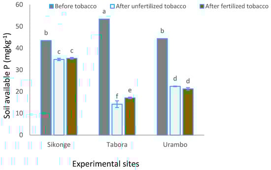 Soil N (0.06%) for Sikonge was significantly (p < 0.001) higher when compared with total that of Tabora and Urambo (0.04%) (Table 2). Total soil N increased significantly (p < 0.001) from 0.04% to 0.05% and 0.06% in unfertilized and fertilized tobacco, respectively. The highest available soil P (37.87 mg kg−1) was in Sikonge, followed by 29.36 mg kg−1 in Urambo and 28.14 mg kg−1 in Tabora. The available P was significantly (p < 0.001) reduced from 47.09 to 23.81 and 24.56 mg kg−1 in unfertilized and fertilized tobacco cultivated soils, respectively. Significant interactions between sites and fertilizer application was observed in this study. Available soil P in Sikonge was reduced significantly (p < 0.001) from 43.48 mg kg−1 before planting tobacco to 34.8 mg kg−1 in unfertilized tobacco soils. Before tobacco cultivation at the site, soil P was 53.31 mg P kg−1 and was reduced to 14.22 mg kg−1 at the end of the season. In the Urambo soil, P decreased from 44.41 to 22.43 mg kg−1 before planting tobacco in unfertilized treatments (Figure 4). Therefore, these findings indicated that cultivation of tobacco caused a decrease in P and the decrease was higher when the plants were grown without fertilizers.