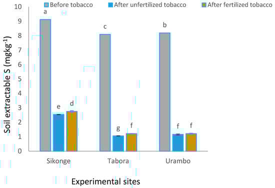Extractable soil S followed a similar trend of P for Sikonge, Tabora, and Urambo (Table 2). Sikonge soil had significantly (p < 0.001) the highest S (4.80 mg kg−1) followed by Urambo (3.52 mg kg−1) and Tabora (3.45 mg kg−1) soils. The extractable S was reduced from 8.47 to 1.59 mg kg−1 between uncultivated and cultivated tobacco in unfertilized soils. The cultivation of tobacco caused a decrease in extractable S, and the decrease was higher when the plants were grown without fertilizers. Interactions between sites and treatments indicated that extractable S levels were significantly (p < 0.001) decreased in all sites after tobacco cultivation regardless of the fertilizer applications (Figure 5). Tobacco cultivation without fertilization resulted in the reduction of extractable S from 9.12 to 1.06 mg kg−1 in all soils. The application of fertilizer in tobacco cultivated soils increased extractable S from 2.74 to 1.21 mg kg−1 relative to unfertilized tobacco cultivated soils where S decreased from 2.54 to 1.06 mg kg−1. The decrease of soil S in unfertilized tobacco could be due to the high plant requirement of this nutrient for its metabolic activities [].