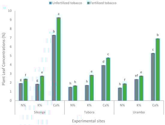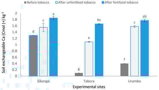 Soil exchangeable Ca differed significantly (p < 0.001) across the sites where the highest (1.56 cmol (+) kg−1) was recorded in Sikonge (Table 2). Inclusion of tobacco significantly (p < 0.001) increased Ca in soils from 0.60 to 1.41 and 1.76 cmol (+) kg−1 in unfertilized and fertilized plots, respectively. Interactions between sites and treatments on Ca were significant (Figure 7). In all sites, soil exchangeable Ca was higher in fertilized tobacco. The increase in Ca in the unfertilized tobacco cultivated soils could be attributed to the mineralization of inherent Ca from parent material due to acidification caused by nicotine. Soil texture is an essential factor that determined concentrations of these macronutrients in tobacco plants and the differences observed [].