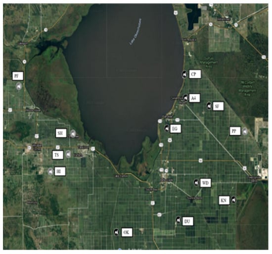 The top visible dewlap leaf was randomly collected for each variety from five, thirty, and fifty plants, respectively, in the CP breeding nursery, primary and secondary seedcane increase fields. The leaf samples were collected from plant cane. Approximately 80% (1195 varieties) of the CP breeding nursery (Table 1) was surveyed for SCYLV infection in 2016. The CP breeding nursery was planted in February 2015 and each plot was ~3.7 m in length with an 1.8 m alley. The varieties in the seed increases (primary and secondary) of the CP program were also tested annually for the SCYLV infection from 2015 to 2019. Each plot in the primary increase consisted of 3 rows ~135 m in length and each plot in the secondary increase consisted of 2 rows ~777 m in length. The primary and secondary increases are planted at different locations throughout South Florida. The varieties for primary and secondary increases in seedcane on muck soil were planted at seven commercial growers’ farms (Area 4 of US Sugar Corporation (A4, 26°51′34.7″ N 80°36′23.3″ W), A. Duda & Sons, Inc. (Belle Glade, FL, USA) (DU, 26°35.93′ N, 80°37.81′ W), Eastgate Farms, Inc. (Pahokee, FL, USA) (EG, 26°47.67′ N, 80°39.97′ W), Knight Management, Inc. (Sixmile Bend, FL, USA) (KN, 26°38.53′ N, 80°27.21′ W), Okeelanta Corporation (South Bay, FL, USA) (OK, 26°34.35′ N, 80°49.72′ W), Sugar Farms Cooperative North-Osceola Region (Pahokee, FL, USA) (SF, 26°50.53′ N, 80°31.93′ W), and Wedgworth Farms, Inc. (Belle Glade, FL, USA) (WD, 26°40.73′ N, 80°34.37′ W) and on sand soils in four commercial growers’ farms (Hilliard Brothers of Florida Ltd. (Montura, FL, USA) (HI, 26°42.14′ N, 81°2.31′ W), Pahokee Produce Inc. (Westlake, FL, USA) (PP, 26°47.26′ N, 80°25.09′ W), Perry Farms/Lykes Bros. (Moore Haven, FL, USA) (PF, 26°45.7′ N, 80°23.7′ W), and Townsite (Clewiston, FL, USA) (TS, 26°44.37′ N, 80°58.95′ W) in November each year. Since 2016, primary and secondary seed increase fields on sand soil were planted at Shawnee farm (Shawnee, FL, USA) (SH, 26°46.59′ N, 80°58.02′ W) (Figure 1). The primary and secondary seed increase trials started at the SH location in 2016 and the PF location the following year. In 2015, nine varieties in primary increase and five varieties in the secondary increase were surveyed. In 2016, the primary and secondary increases had eight varieties in each trial but only two varieties were on muck soil. In 2017, 2018, and 2019, the primary and secondary increase trials together, respectively, consisted of 17, 9, and 11 varieties.