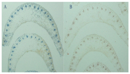 Tissue-blot immunoassay of midrib of top visible dewlap leaves. (A) Infected leaves; (B) healthy leaves. The blue dots are stained phloem cells where the virus lives.