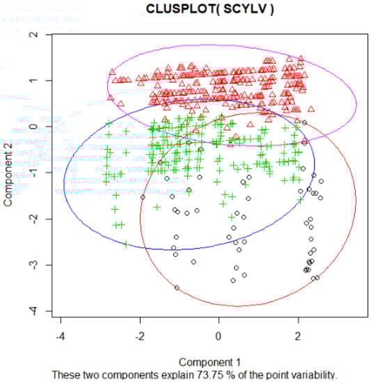 Varieties were divided into three clusters based on percent incidence of SCYLV analyzed by k-means clustering. The red circle represents cluster 1, blue circle cluster 2, and purple circle cluster 3. o, varieties in the cluster 1, +, varieties in the cluster 2 and ∆,varieties in the cluster 3.